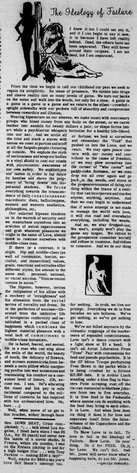 "And so, we stay dropped-out. We won't, simply won't play the game any longer. We return to the prosperous consumer society and refuse to consume. And refuse to consume. And we do our thing for nothing. In truth, we live our protest. Everything we do is free because we are failures. We've got nothing to lose, so we've got nothing to lose. We're not fooled anymore by the romantic trappings of the marketeers of expanded consciousness. Love isn't a dance concert with a light show at $3 a head. It isn't an Artist Liberation Front 'Free' Fair with concessions for food and pseudo psychedelia. It is the SF Mime Troupe performing Free Shows in the parks while it is being crushed by a furious $15,000 debt. It is Arthur Lisch standing under a blue flag in Hunters Point scraping rust off the tin-can memorial to Matthew Johnson from two to five everyday. It is free food in the Panhandle where anyone can do anything with the food they bring to each other. It is Love. And when love does its thing it does it for love and separates itself from the false-witness of the Copsuckers and the Gladly Dead. ... To Show Love is to fail. To love to fail is the Ideology of Failure. Show Love. Do your thing. Do it for FREE. Do it for Love. We can't fail."