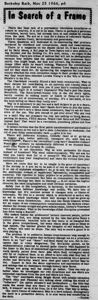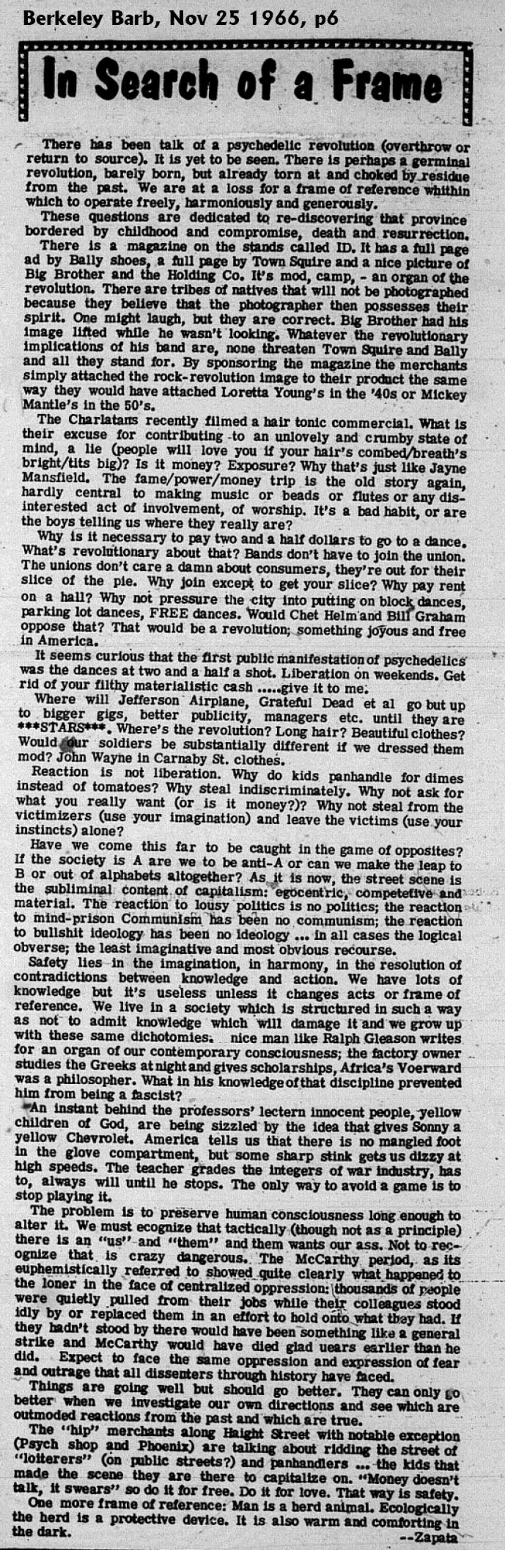 Cat. No.: DP-19661125 Full record BibCit: By Zapata [pseud.]. Berkeley Barb, 11/25/1966, p. 6. Collection: Bell & Howell. Abstract: This essay is a sharp Digger critique of the emerging psychedelic scene as it drifted toward commodification, celebrity, and empty reaction. Rejecting both the “hip” merchants of Haight Street and the pay-to-enter culture of psychedelic dances, it calls instead for a genuinely liberatory social frame grounded in free action, imagination, mutual aid, and collective resistance to capitalist and authoritarian structures. The piece argues that true revolution requires more than anti-establishment style or posture: it demands a transformed “frame of reference” that aligns knowledge with action and replaces competition, materialism, and passive complicity with love, courage, and communal solidarity.