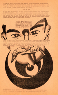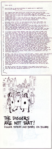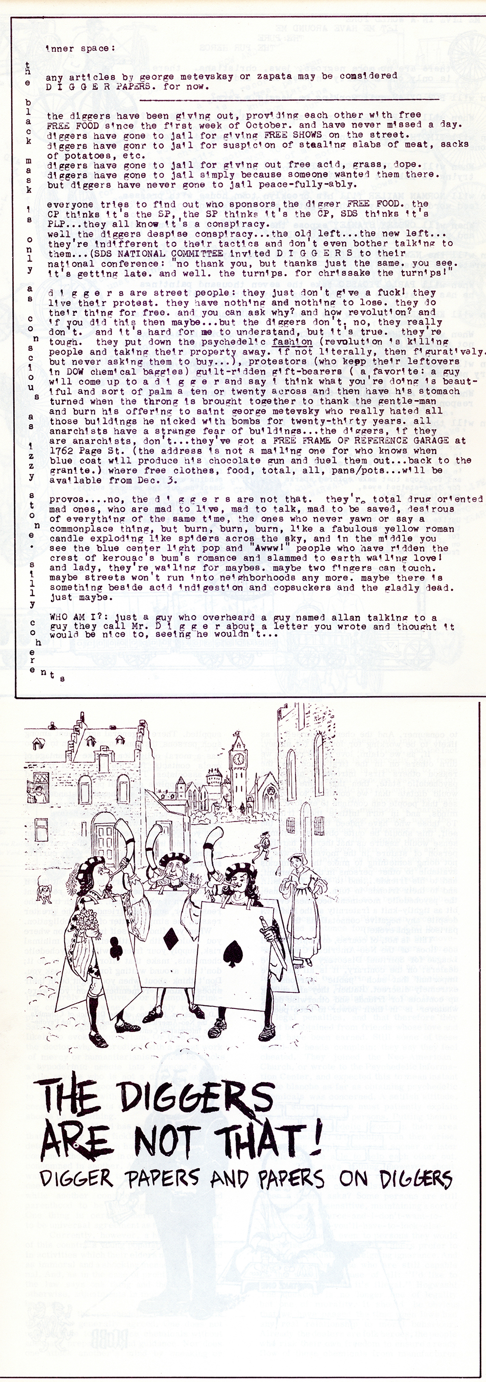 Cat. No.: DP-19661200 Full record BibCit: Innerspace Magazine, ca. 12/1/1966, vol. 1, no. 3 (December 1966). Abstract: This letter is both a declaration and a performance: it identifies the writings of “Metevsky” and “Zapata” as Digger papers, then defines the Diggers not as a political sect or ideological faction but as people who “live their protest” through free action in the street. It catalogs their public practices—free food, free shows, free drugs, arrests, refusal of respectable behavior—and sharply rejects the frameworks through which others try to explain them, whether Old Left, New Left, SDS, or conspiracy politics. The Diggers are presented as indifferent to doctrine and organization, committed instead to immediacy, risk, and a lived revolution grounded in giving things away, refusing commodification, and collapsing the distance between idea and act.