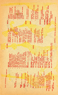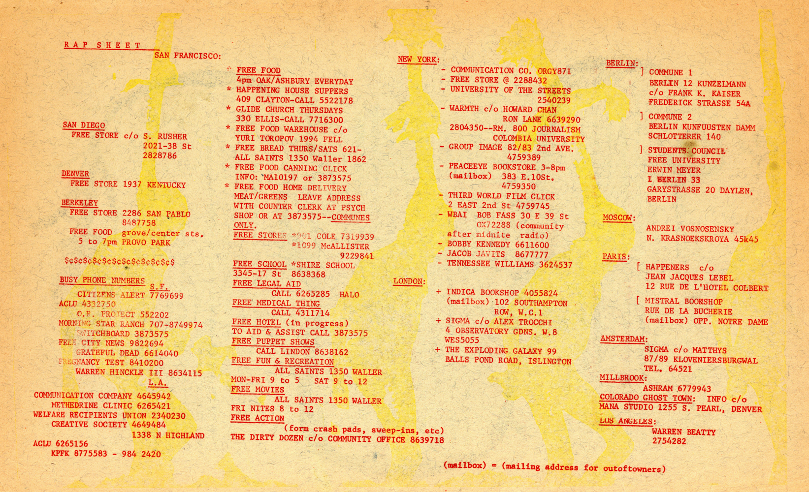 Cat. No.: FC-1-005b Full record BibCit: n.d., ca. 10/1/1967. Broadsheet. San Francisco: Free City Collective. Collection: SOLA-o; SS-o (MH). Abstract: This Free City “Rap Sheet” serves as a decentralized directory of countercultural and underground resources, linking San Francisco to a wider network of free stores, free food programs, communes, legal aid, media, bookstores, and contact points across the United States and Europe. More than a mere list, it maps the infrastructure of an emerging Free City world: practical, mobile, improvised, and translocal, with addresses and phone numbers standing in for a new social geography of mutual aid and alternative institutions. The ghosted yellow figures behind the red type give the page a loose, processional quality, as if this network were not static but already in motion.