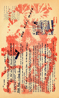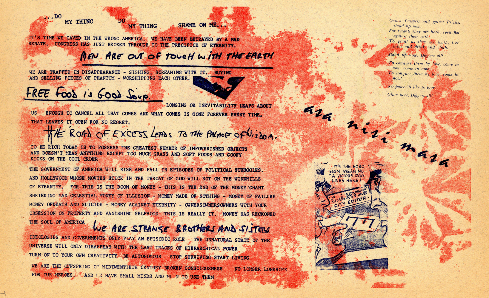 Cat. No.: FC-1-007a Full record BibCit: n.d., ca. 10/1/1967. Broadsheet. San Francisco: Free City Collective. Collection: SOLA-o; SS-o (MH). Abstract: This piece is a dense, improvisational Free City collage of manifesto, lament, and ecstatic exhortation, layering typed polemic, handwritten slogans, scattered quotations, and found imagery into a vision of America in spiritual and political collapse. Against denunciations of money, hierarchy, false power, and the dead weight of official politics, the sheet counters with Digger-style affirmations—free food, autonomy, brotherhood and sisterhood, and the insistence that people stop merely surviving and begin living. Its splattered red ground and fractured composition give the page the look of something half-broadcast, half-erupted, as though consciousness itself were breaking through the ruins of the established order.