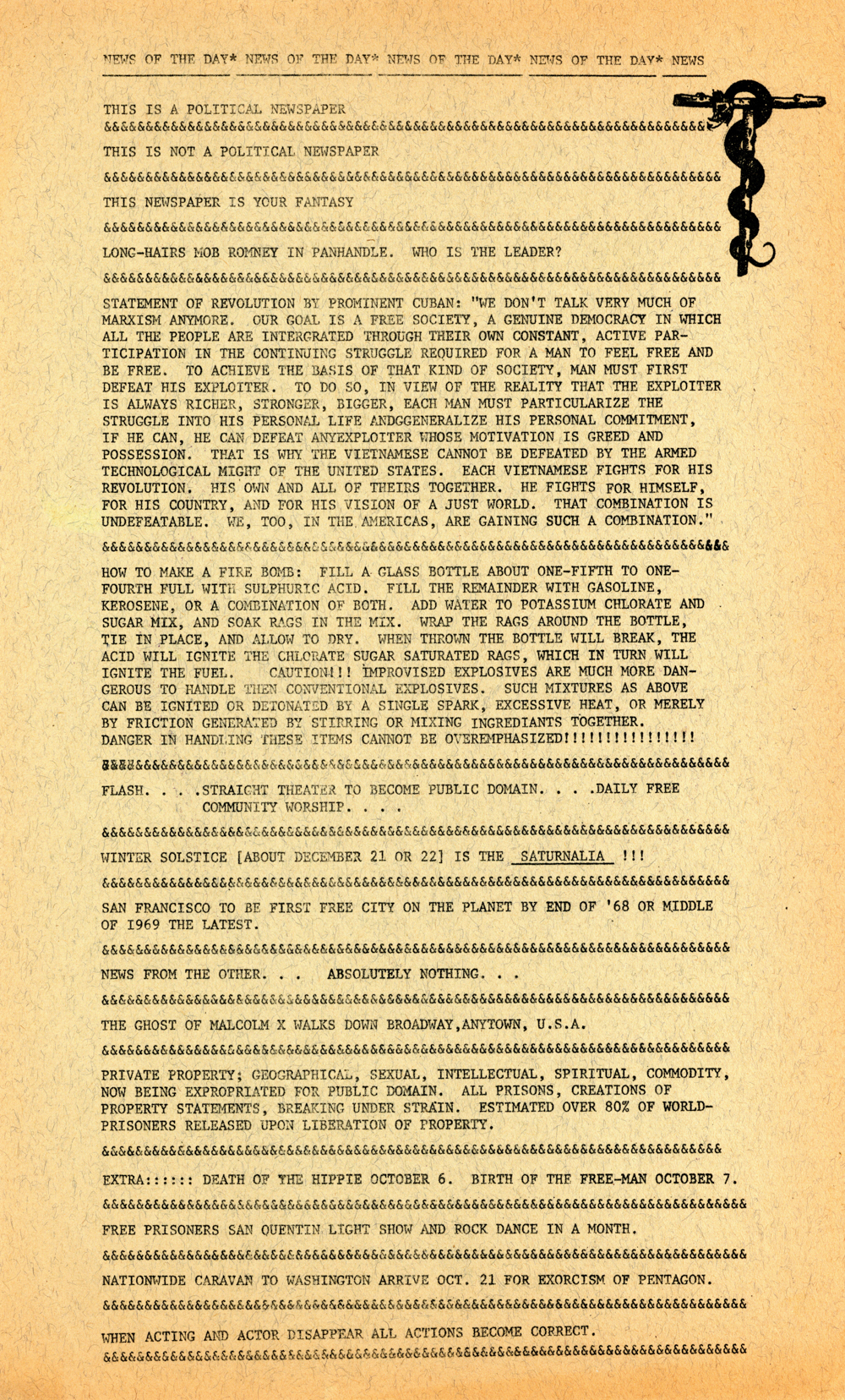 Cat. No.: FC-1-002a Full record BibCit: n.d., ca. 10/1/1967. Broadsheet. Legal size. San Francisco: Free City Collective. Collection: SOLA-o; SS-o (MH). Abstract: Reads like a delirious dispatch from the edge where news, prophecy, parody, and insurgent desire all collapse into one another. It mimics the form of a newspaper only to sabotage its authority at every turn: “This is a political newspaper / This is not a political newspaper / This newspaper is your fantasy.” In that refusal, it announces a Digger understanding of politics not as platform or party, but as lived transformation—personal, collective, theatrical, and immediate. The piece moves restlessly from world revolution to Panhandle street scenes, from the ghost of Malcolm X to the coming “Free City,” from the Exorcism of the Pentagon to the Death of the Hippie and Birth of the Free Man. Its real subject is the dissolution of private property in every sense—material, sexual, spiritual, even artistic—and the emergence of a participatory social world in which ordinary life itself becomes liberated performance.