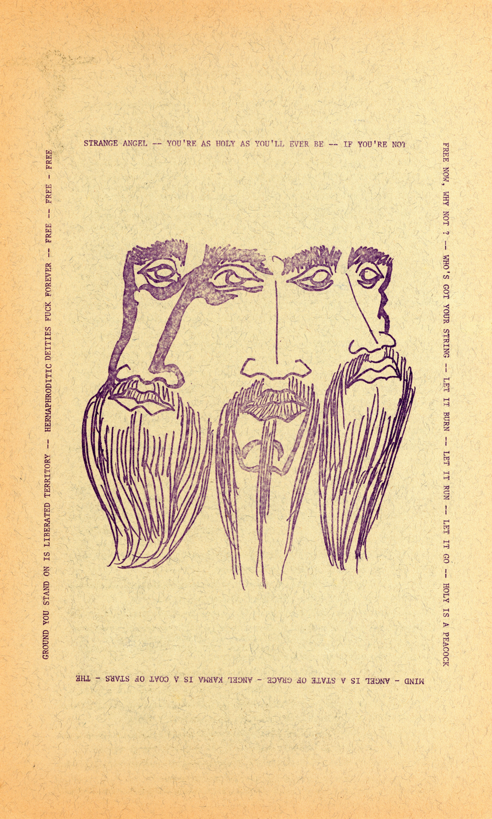 Cat. No.: FC-1-002b Full record BibCit: n.d., ca. 10/1/1967. Broadsheet. Legal size. San Francisco: Free City Collective. Collection: SOLA-o; SS-o (MH). Abstract: This striking and highly economical sheet functions less as a news item or argument than as a visionary invocation. At its center is a purple line drawing of a triple-faced, bearded figure—part saint, prophet, trickster, and street oracle—floating in a large field of textured paper. Around the margins runs a ring of incantatory text: “STRANGE ANGEL,” “YOU’RE AS HOLY AS YOU’LL EVER BE,” “FREE NOW, WHY NOT?,” “LET IT BURN,” “LET IT RUN,” “LET IT GO,” and “GROUND YOU STAND ON IS LIBERATED TERRITORY.” Other phrases—“HOLY IS A PEACOCK MIND,” “ANGEL IS A STATE OF GRACE,” and “ANGEL KARMA IS A COAT OF STARS”—give the piece the air of queer mysticism, absurdist prophecy, and countercultural mantra. Spare, talismanic, and theatrical, the sheet reads as a kind of portable street icon, fusing underground print aesthetics with a rhetoric of liberation, psychic unbinding, and transformed social being.