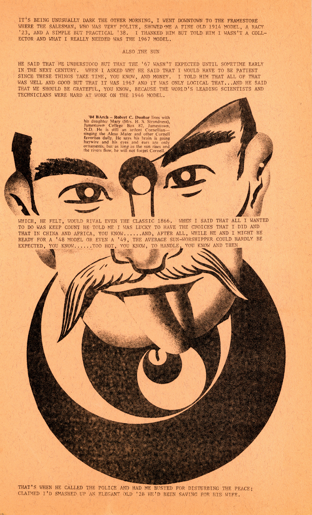 Cat. No.: FC-1-003a Full record BibCit: n.d., ca. 10/1/1967. Broadsheet. San Francisco: Free City Collective. Collection: SOLA-o; SS-o (MH). Abstract: This sheet takes the form of a comic monologue but underneath it is a pointed critique of managed desire, technological delay, and the absurd promises of modern progress. Framed as a visit to a “framestore” in search of the long-awaited “1967 model,” the text parodies the logic of endless postponement, in which people are told to be patient, grateful, and content with obsolescence while the future is always deferred. The salesman’s oily reassurances—full of “you know” and pseudo-reasonable explanations—mock the language of authority and expose a world in which scarcity and delay are normalized. Visually, the sheet is anchored by a large stylized face with a vaguely solar or hypnotic force, interrupted by a clipped biographical fragment that gives the whole page the feel of collage-poetry assembled from the debris of print culture. The final turn, in which the speaker is busted after smashing an old model, turns the joke into a small parable of frustration and revolt in a world where even the sun has been bureaucratized.