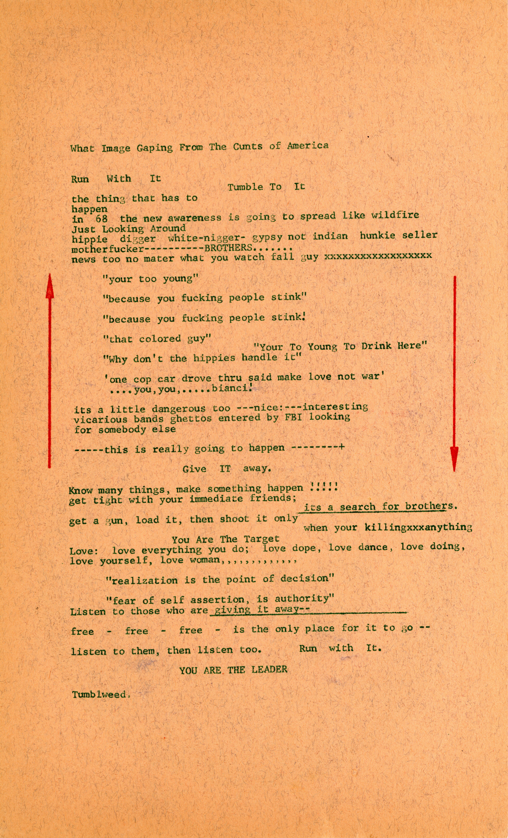 Note: Signed "Tumbleweed" — one of the pseudonyms for Bill Fritsch. See Ringolevio, p. 281 ff., for Emmett Grogan’s description of Tumble.