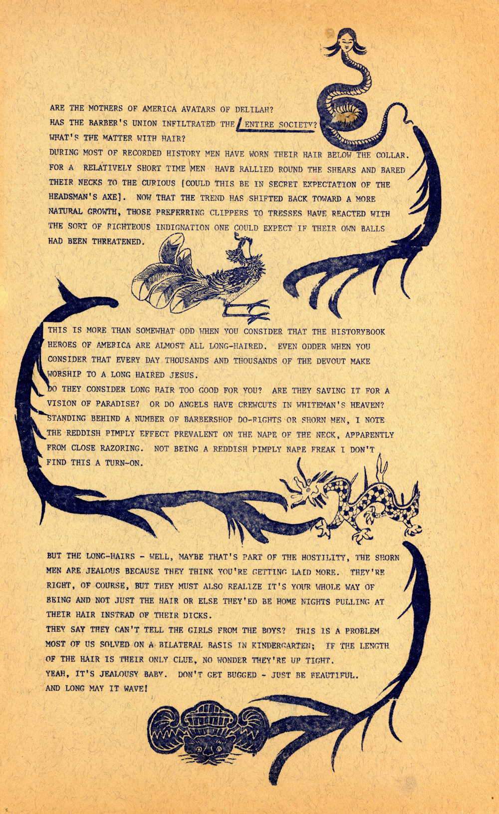 Cat. No.: FC-1-005a Full record BibCit: n.d., ca. 10/1/1967. Broadsheet. San Francisco: Free City Collective. Collection: SOLA-o; SS-o (MH). Abstract: This Free City sheet is a comic, confrontational defense of long hair as a mark of beauty, freedom, and nonconformity, turning the period’s obsession with male hair length into a satire on sexual anxiety, social control, and straight society’s moral panic. Written in a deliberately mocking, conversational voice, it argues that hostility to “long-hairs” reflects jealousy and repression more than principle, while linking barbers, shorn respectability, and conventional masculinity to a broader culture of conformity. The page’s whimsical yet slightly menacing graphic border—serpentine forms, hybrid creatures, and ornamental fantasy figures—reinforces the text’s blend of camp, provocation, and countercultural style.