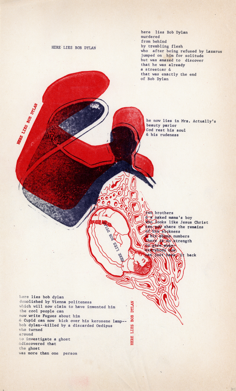 Cat. No.: FC-1-006 Full record BibCit: n.d., ca. 10/1/1967. Broadside. San Francisco: Free City Collective. Collection: SOLA-o; SS-o (MH). Abstract: This visually dense and sardonic broadside stages yet another symbolic death of Bob Dylan, not as obituary but as cultural exorcism. Through fractured typed verse, repeated funerary invocation, and biomorphic red-and-black imagery, it turns Dylan into a contested emblem—murdered, dispersed, and reclaimed by the overlapping projections of hip society, messianic longing, and psychic theater. The piece reads less as commentary on the man himself than as an attack on the making and unmaking of celebrity within the counterculture.