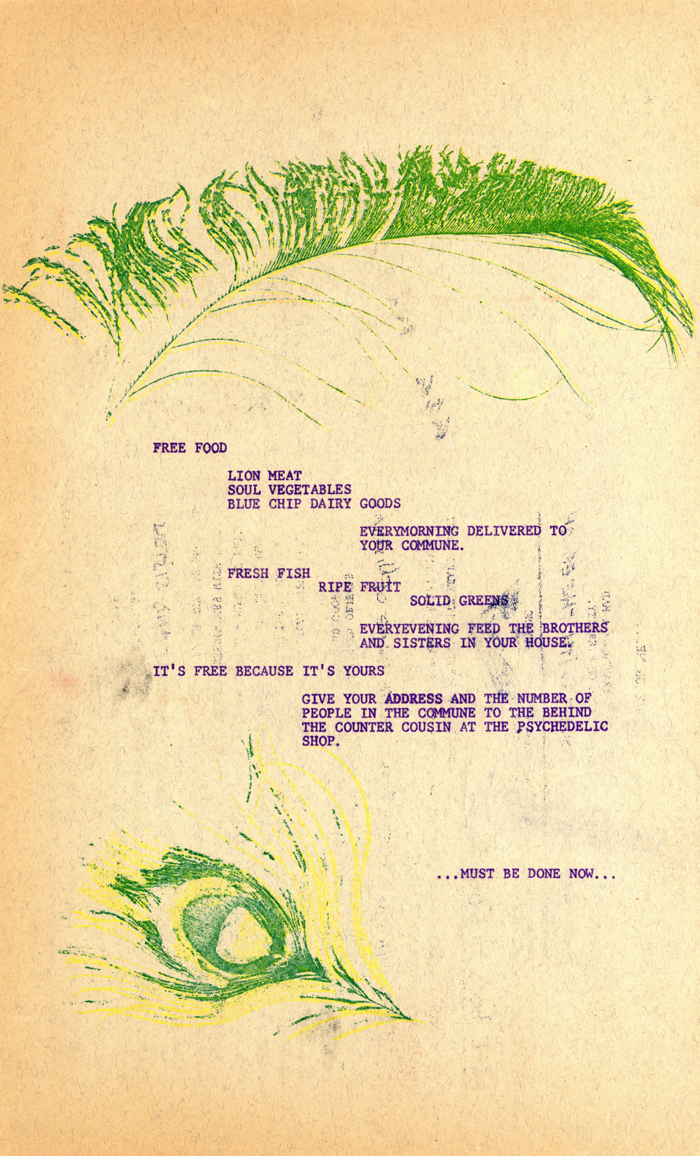 Cat. No.: FC-1-007b Full record BibCit: n.d., ca. 10/1/1967. Broadsheet. San Francisco: Free City Collective. Collection: SOLA-o; SS-o (MH). Abstract: This Free City sheet is a direct organizing notice for the expansion of free food beyond the Panhandle into the communes, calling for a practical network of daily distribution and shared provisioning. Listing donated staples—meat, vegetables, dairy goods, fish, fruit, and greens—it presents food not as charity or relief but as collective property: “It’s free because it’s yours.” The airy feather- or peacock-like imagery softens the page visually, but the message is urgent and concrete, ending with an insistence that the work of feeding “the brothers and sisters in your house” must begin at once.