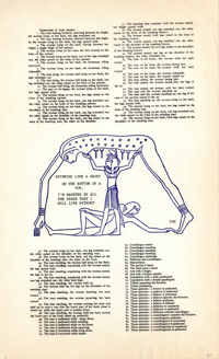 Cat. No.: FC-1-008 Full record BibCit: n.d., ca. 10/1/1967. San Francisco: Free City Collective. Collection: SOLA-o; SS-o (MH). Abstract: This striking Free City page juxtaposes a dry, encyclopedic list of sexual positions with an Egyptianizing central image and a brief lyric meditation on absence, desire, and haunted space. The effect is neither pornographic nor purely comic; rather, it turns erotic taxonomy into collage material, setting clinical enumeration against mythic imagery and poetic interiority. In the context of the Free City project, the piece reads as part of a broader effort to break down conventional boundaries between the sacred and the profane, information and art, body knowledge and visionary play.