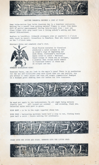 Cat. No.: FC-1-009 Full record BibCit: n.d., ca. 10/1/1967. Broadside. San Francisco: Free City Collective. Collection: SOLA-o; SS-o (MH). Abstract: Reads as a fevered prose poem of urban dread and countercultural refusal, contrasting the deadened routines of downtown work, media fear, and official paranoia with a visionary language of night, risk, grace, and collective release. Its jagged shifts—from Cleveland race panic and atomic dread to “Risk Food” and “Risk Roof”—suggest a world in which the administered realities of wage labor, news, and authority are already collapsing into absurdity. The mysterious letterforms and occult-like graphic framing deepen the page’s prophetic tone, as though the sheet were proposing an alternate script for those trying to escape the living death of ordinary America.