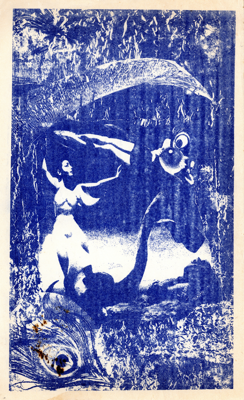 Cat. No.: FC-1-010 Full record BibCit: n.d., ca. 10/1/1967. Broadside. San Francisco: Free City Collective. Collection: SOLA-o; SS-o (MH). Abstract: This piece reads as a dream image or mythic interlude within the Free City sequence: a nude female figure stands beside or confronts a bird-headed, serpent-bodied creature in a lush, peacock-haunted environment. Printed in a dense monochrome blue, the image has the soft, degraded texture of a reproduced collage or altered illustration, which gives it an oneiric, half-submerged quality. In the context of Free City, it seems less like an argument than an atmosphere piece, bringing together eroticism, metamorphosis, fantasy, and the decorative excess that runs through much of the project’s visual language.