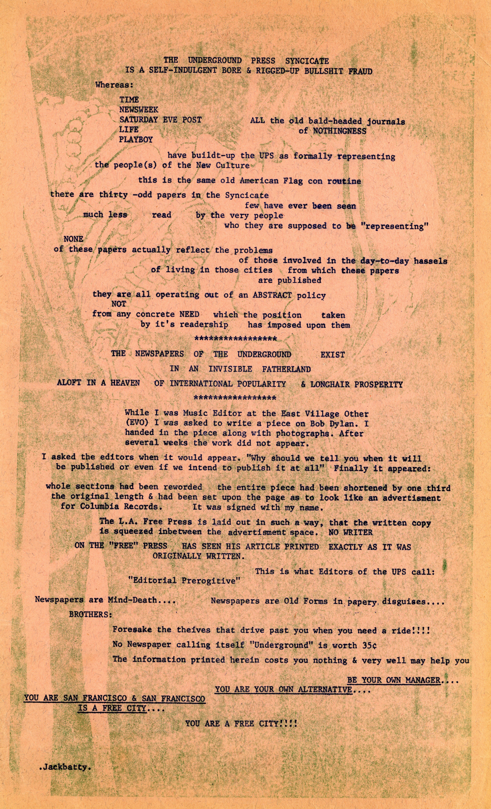 Cat. No.: FC-1-011a Full record BibCit: n.d., ca. 10/1/1967. Broadsheet. San Francisco: Free City Collective. Collection: SOLA-o; SS-o (MH). Abstract: A blistering attack on the Underground Press Syndicate, accusing the alternative press of reproducing the same hollow structures of mediation, editorial control, and false representation as the mainstream media it claimed to oppose. Mixing polemic with firsthand grievance, the text argues that underground papers do not arise from the concrete needs of their readers but from an abstract, self-important culture of editors, popularity, and packaged dissent. Its answer is the characteristic Free City reversal: do not look to newspapers, managers, or cultural intermediaries to speak for you—“you are your own alternative,” and San Francisco itself must become a free city through direct action and self-organization.