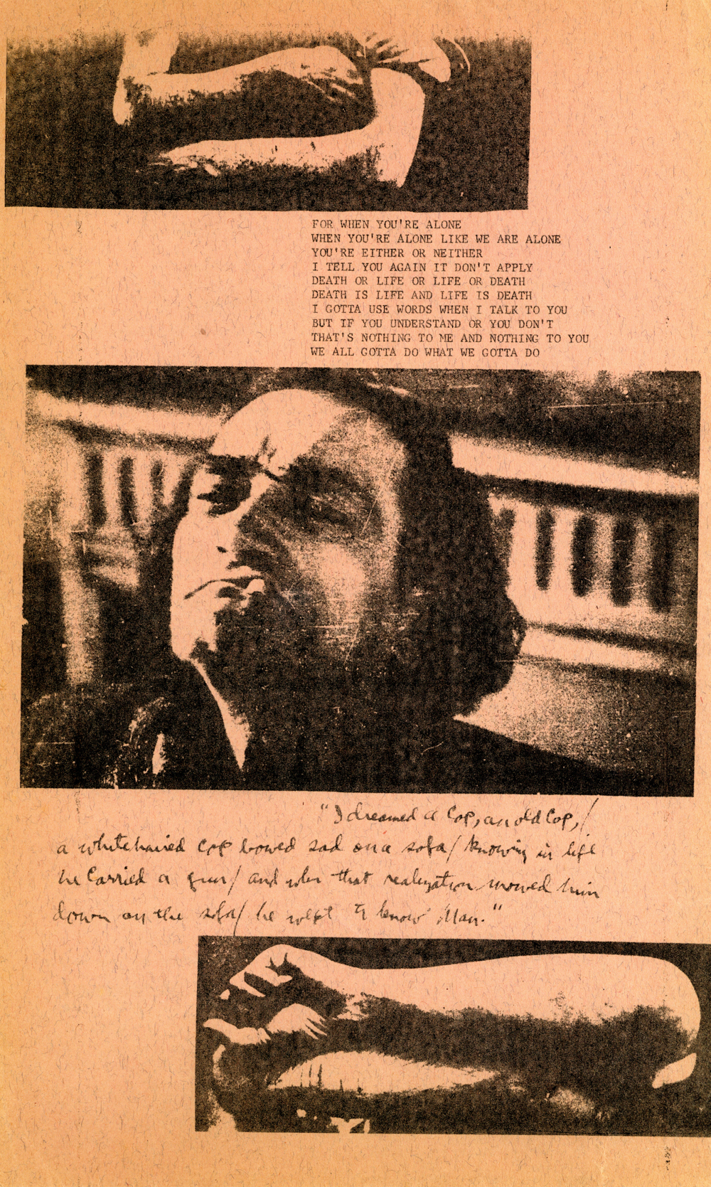 Cat. No.: FC-1-011b Full record BibCit: n.d., ca. 10/1/1967. Broadsheet. San Francisco: Free City Collective. Collection: SOLA-o; SS-o (MH). Abstract: Combines blurred photographic images, typed verse, and a handwritten dream fragment to create an atmosphere of solitude, mortality, and psychic unease. The repeated reclining figure, the stark portrait, and the lines about being alone and the interchangeability of life and death give the piece the feel of a dream document or private visionary notebook rather than a polemical broadside. In the context of Free City, it suggests the extent to which the project could also make room for intimate, haunted, inward material alongside its more public calls to action.
