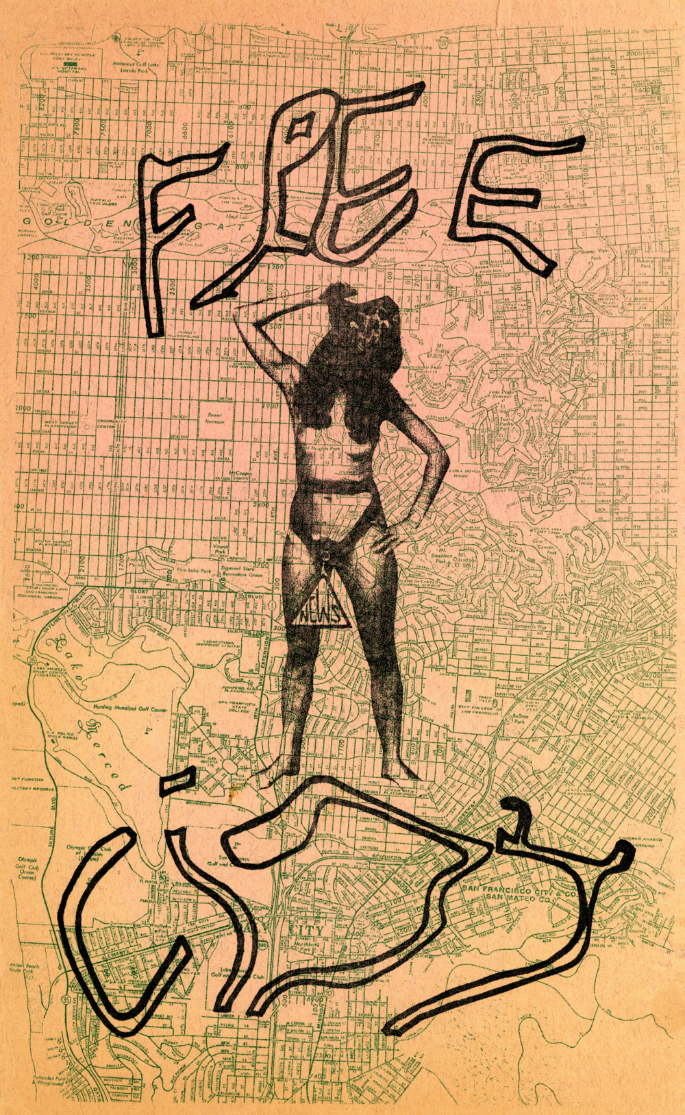 Cat. No.: FC-1-012 Full record BibCit: n.d., ca. 10/1/1967. Broadside. San Francisco: Free City Collective. Collection: SOLA-o; SS-o (MH). Abstract: As the parting image in Free City Set #1, this sheet recasts San Francisco itself as the terrain of a Free City imaginary, overlaying a street map with the large hand-drawn words FREE CITY and a central female figure poised like an emblem, muse, or tutelary spirit of the place. The belt or banner at her waist, bearing the word “NEWS” links that figure directly to the project of Free City as an alternative mode of communication, suggesting that the liberated city is not only inhabited but spoken, circulated, and imagined into being. The effect is both declarative and visionary: the existing grid of official geography is overlaid by a counter-map of freedom, desire, and collective possibility.