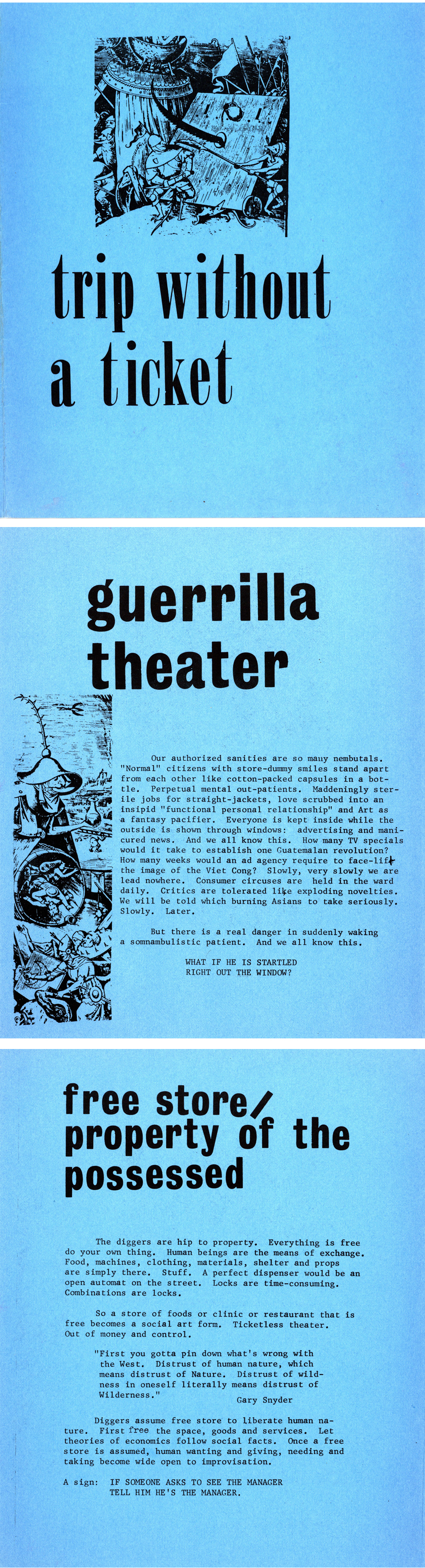 Cat. No.: DP-twat-ed1 Full record BibCit: n.d., ca. 2/1/1967. Booklet. 7 x 8.5 in. 8 p. Collation: printed on 2 8.5"x14" sheets of paper on both sides, folded in half to make 7" wide by 8.5" tall pages, the two sheets interfolded to make a publication that is 8 pages, illus. Abstract: One of the foundational texts of the Diggers that fuses Digger theories of guerrilla theater, the Free Store, and street events into a vision of cultural and social liberation. It argues that modern capitalist society functions as a kind of managed asylum, numbing people through consumer spectacle, work discipline, media distance, and property relations. Against this enclosure, the text proposes “life-actors” who break the glass of passive spectatorship through direct action: theater that abolishes the boundary between stage and street, free stores that turn goods into shared social improvisation, and public rituals that reclaim urban space for collective joy, imagination, and human exchange.