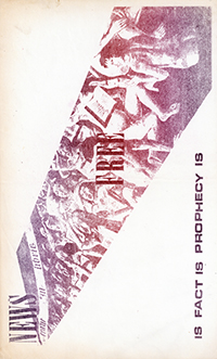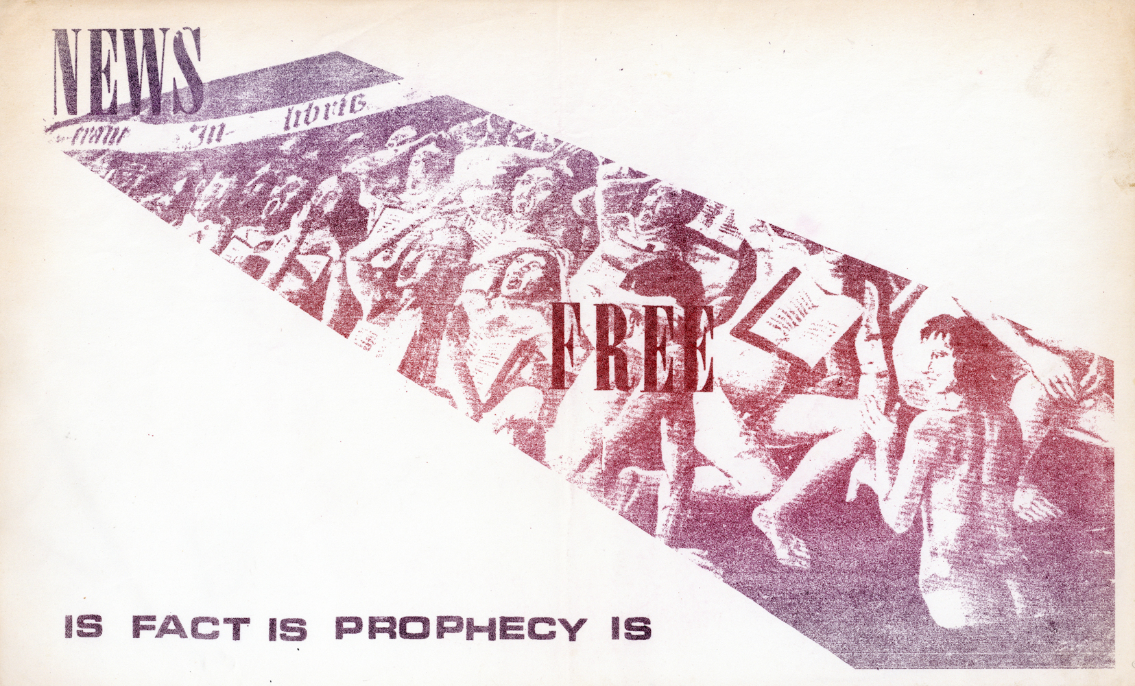 Cat. No.: FC-2-002 Full record BibCit: n.d., ca. 11/1/1967. Broadside. San Francisco: Free City Collective. Collection: SOLA-o; SS-o (MH). Abstract: This piece collapses the usual boundary between reporting and revelation. By declaring that news is “fact” and “prophecy” at once, the sheet presents itself not as neutral chronicle but as an active force within the making of the new social body it depicts. The angled crowd scene—apparently drawn from the world of Bruegel, or at least evocative of that dense, collective peasant tumult—reinforces the sense of history in motion, as though the paper itself were both witness to and instrument of the Free City.
