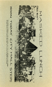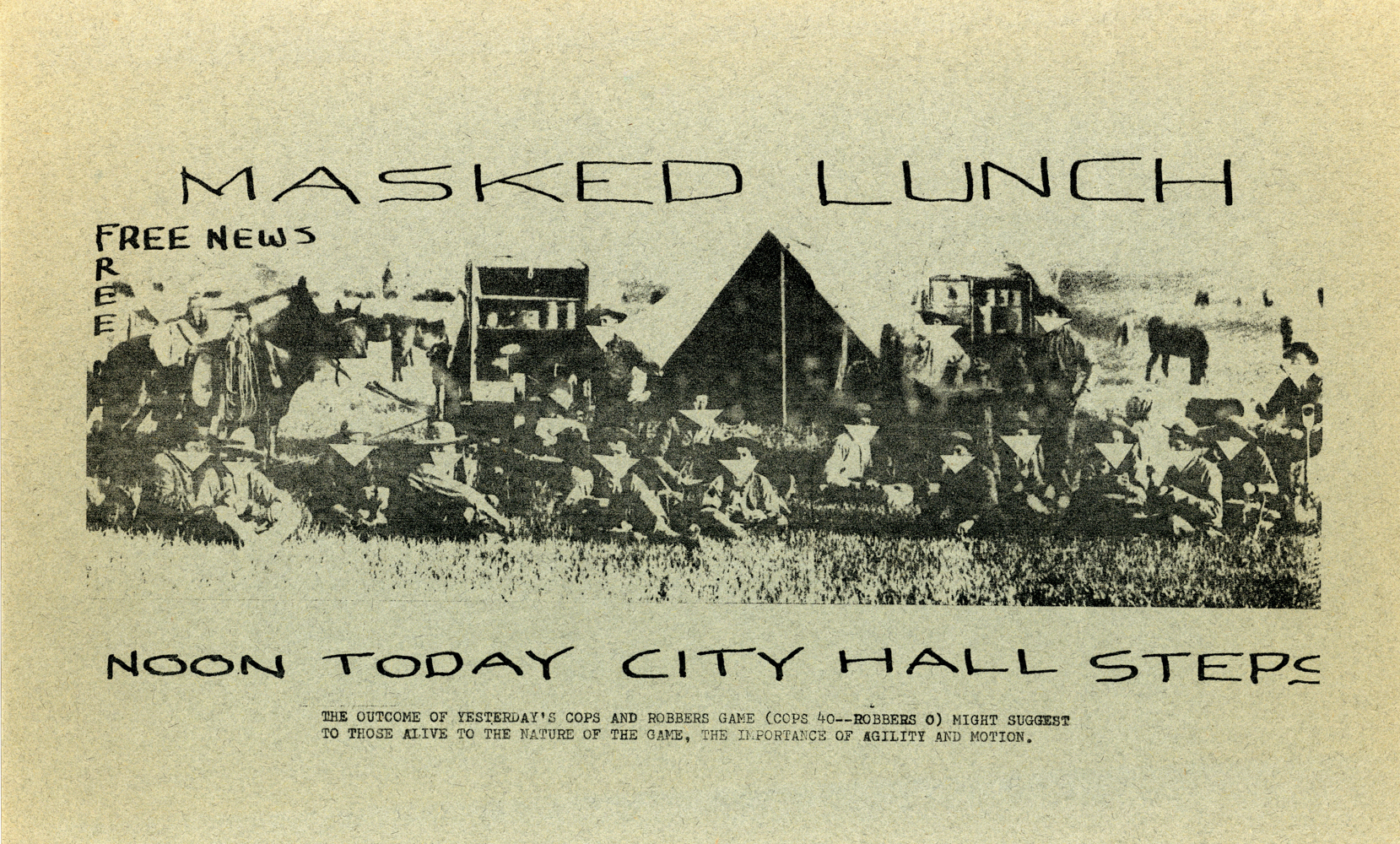 Cat. No.: FC-NEWS-003 Full record BibCit: 5/8/1968. Broadside. Legal size. San Francisco: Free City Collective. Collection: SOLA-o. Abstract: Announcement of a mass "mask-in" at City Hall to protest the "Poetry Bust" the previous day when Ron Thelin was arrested after Judge Axelrod confronted him for wearing a bandanna covering his face. Four others were also arrested, including Ama (aka Thomas C. Baker III) of Willard Street Commune (for wearing an American flag); Israel Jackson, also of Willard Street (for interfering with a police officer); Phyllis Wilner (for interfering with a police officer); and, Charles Perkel (for using profanity). The photograph appears to depict a nineteenth-century mining camp, over which a Free City printer has superimposed triangular masks on each face, converting a historical image into a contemporary emblem of anonymity, collectivity, and social theater.