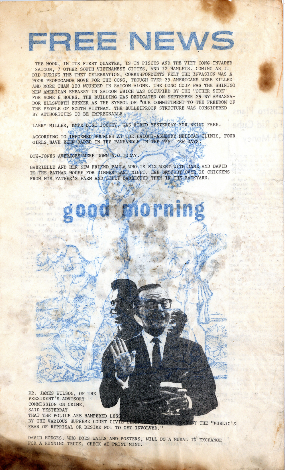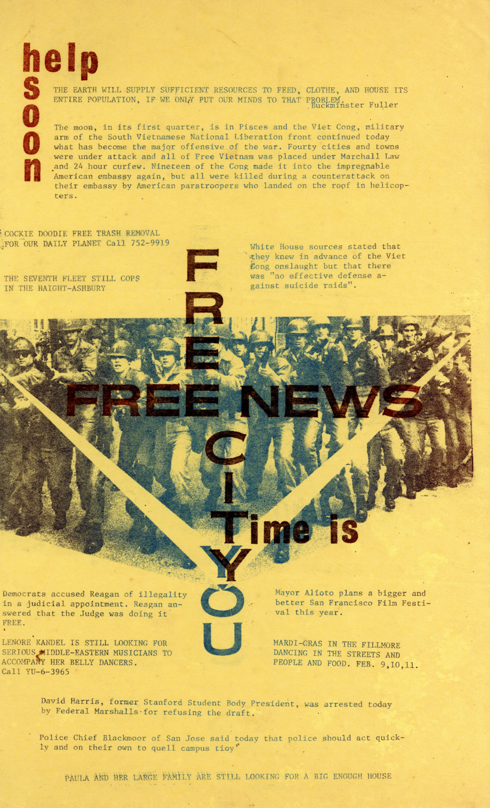 Cat. No.: FC-NEWS-004 Full record BibCit: 2/1/1968. Broadside. Legal size. San Francisco: Free City Collective. Collection: SOLA-o. Abstract: This Free News sheet stages a confrontation between war, authority, and the counter-image of a liberated city. Across a photograph of helmeted police advancing in formation, the words FREE CITY descend vertically while FREE NEWS cuts across the image, turning the page itself into a graphic act of resistance. Around that central collision, the sheet juxtaposes fragments of the Tet Offensive, Vietnam, Reagan, Alioto, Lenore Kandel, Mardi Gras in the Fillmore, housing needs, free trash removal, and street rumor, collapsing official news and local countercultural life into a single field. The result is not a conventional newspaper page but a visual manifesto: the city is figured as a contested zone in which police power, war, festival, need, and free sociality all meet. The phrase “Time is You” gives the sheet its deeper claim, shifting history from the abstractions of the state to the lived agency of the people in the street.