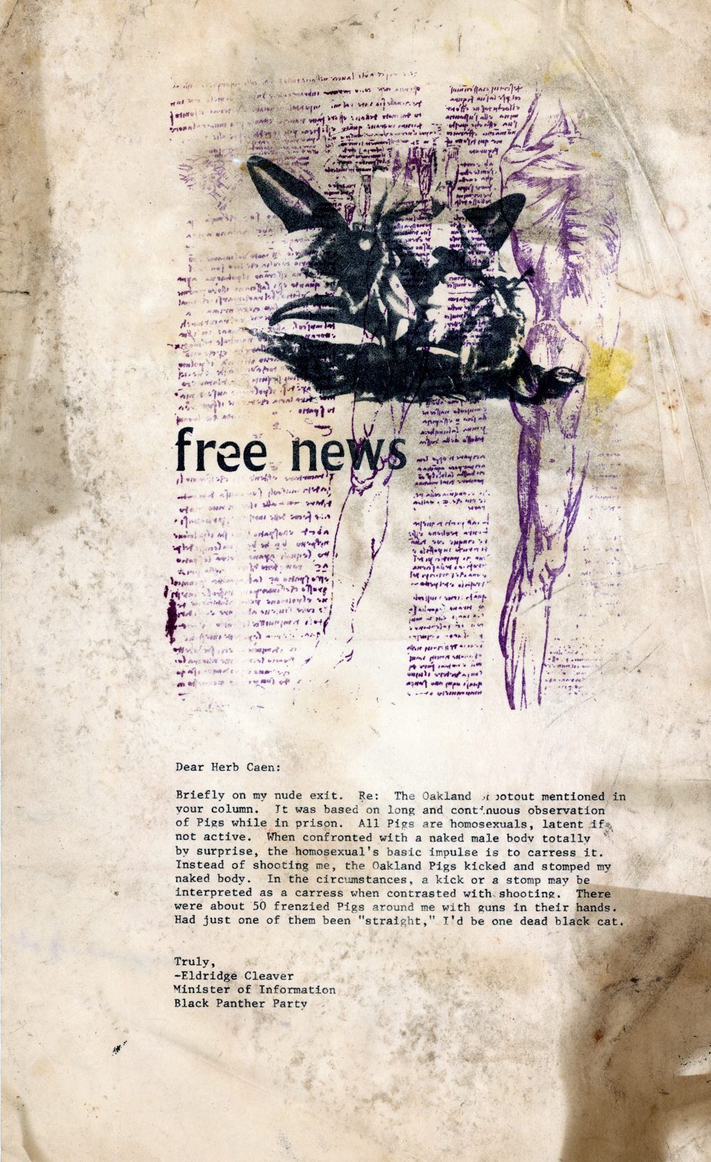 Cat. No.: FC-NEWS-005 Full record BibCit: n.d., ca. 4/15/1968. Broadside. Legal size. San Francisco: Free City Collective. Collection: SOLA-o. Abstract: This Free News sheet layers nude figuration and political mockery into a single charged image. Beneath the spectral purple and black composition appears Eldridge Cleaver’s letter to Herb Caen on the Oakland shootout, turning the naked body into an instrument of irony directed against police power, sexual panic, and public hypocrisy. The piece works less as straightforward reportage than as a visual provocation, fusing underground print aesthetics with the volatile politics of the street.