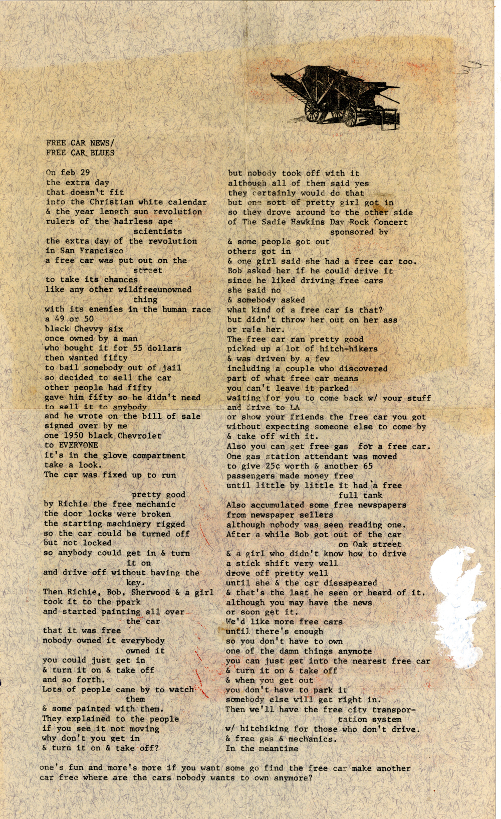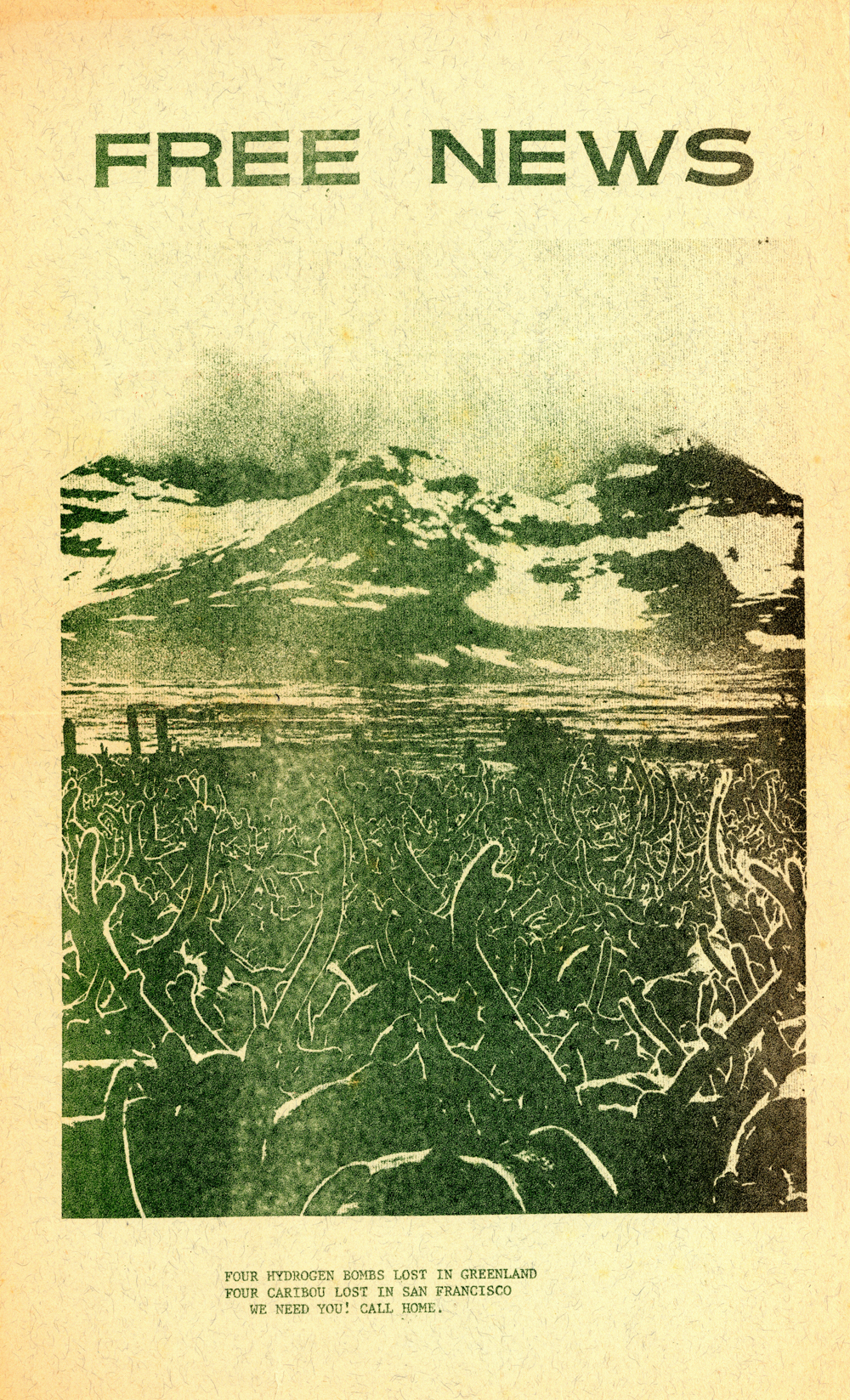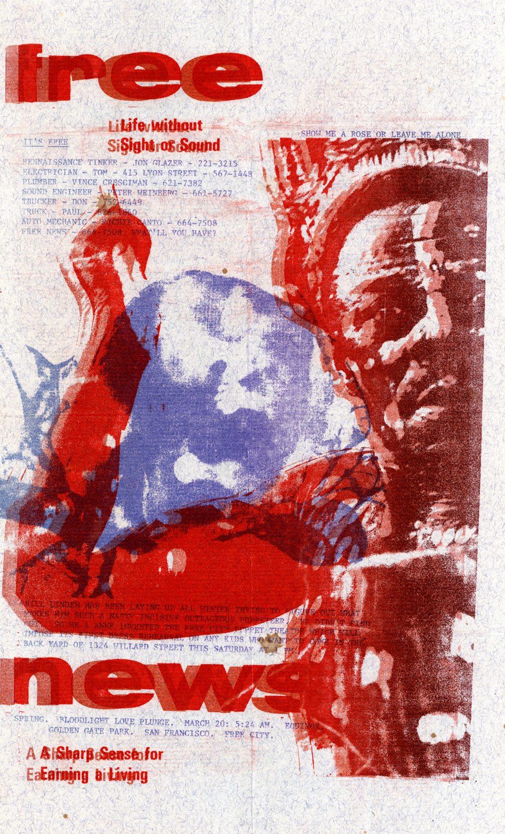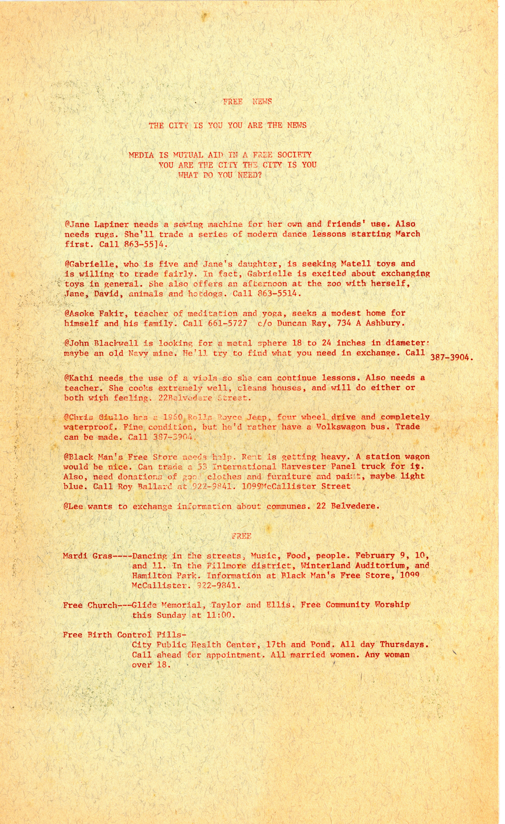 Cat. No.: FC-NEWS-006a Full record BibCit: 1/26/1968. Broadsheet. Legal size. San Francisco: Free City Collective. Collection: SOLA-o. Abstract: This Free News sheet presents the Free City as a lived network of mutual aid rather than a slogan or abstraction. Offers of free labor, housing help, lessons, repair work, childcare, and domestic exchange sit alongside political provocation, astrological timekeeping, and calls for free schools, free streets, and free theater. The effect is to collapse classifieds, manifesto, and street poetry into a single form, where everyday need becomes the ground of social transformation. Its closing line states the principle plainly: “Media is mutual aid in the Free City. You are the city.”