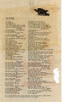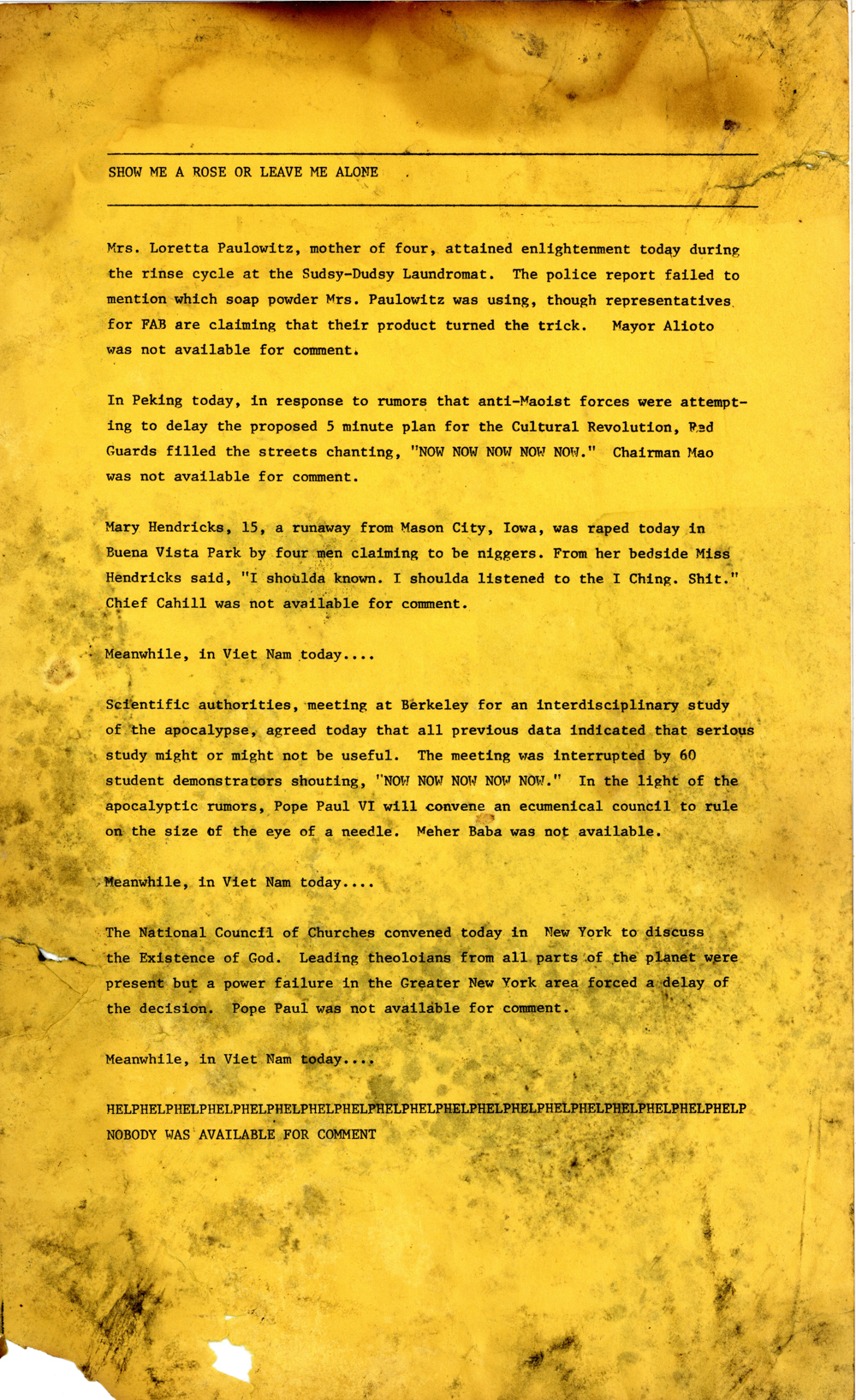 Cat. No.: FC-2-006a Full record BibCit: n.d., ca. 11/1/1967. Broadsheet. Legal size. San Francisco: Free City Collective. Collection: SOLA-o; SS-o (MH). Abstract: A child’s-eye history of civilization in which progress means only bigger wars, better weapons, and a failed escape to the moon.
