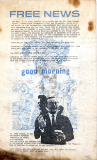 Cat. No.: FC-NEWS-001 Full record BibCit: n.d., ca. 3/1/1968. Broadside. San Francisco: Free City Collective. Collection: SOLA-o. Abstract: A Free News sheet that announces the daily happenings at San Francisco's City Hall.