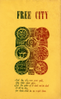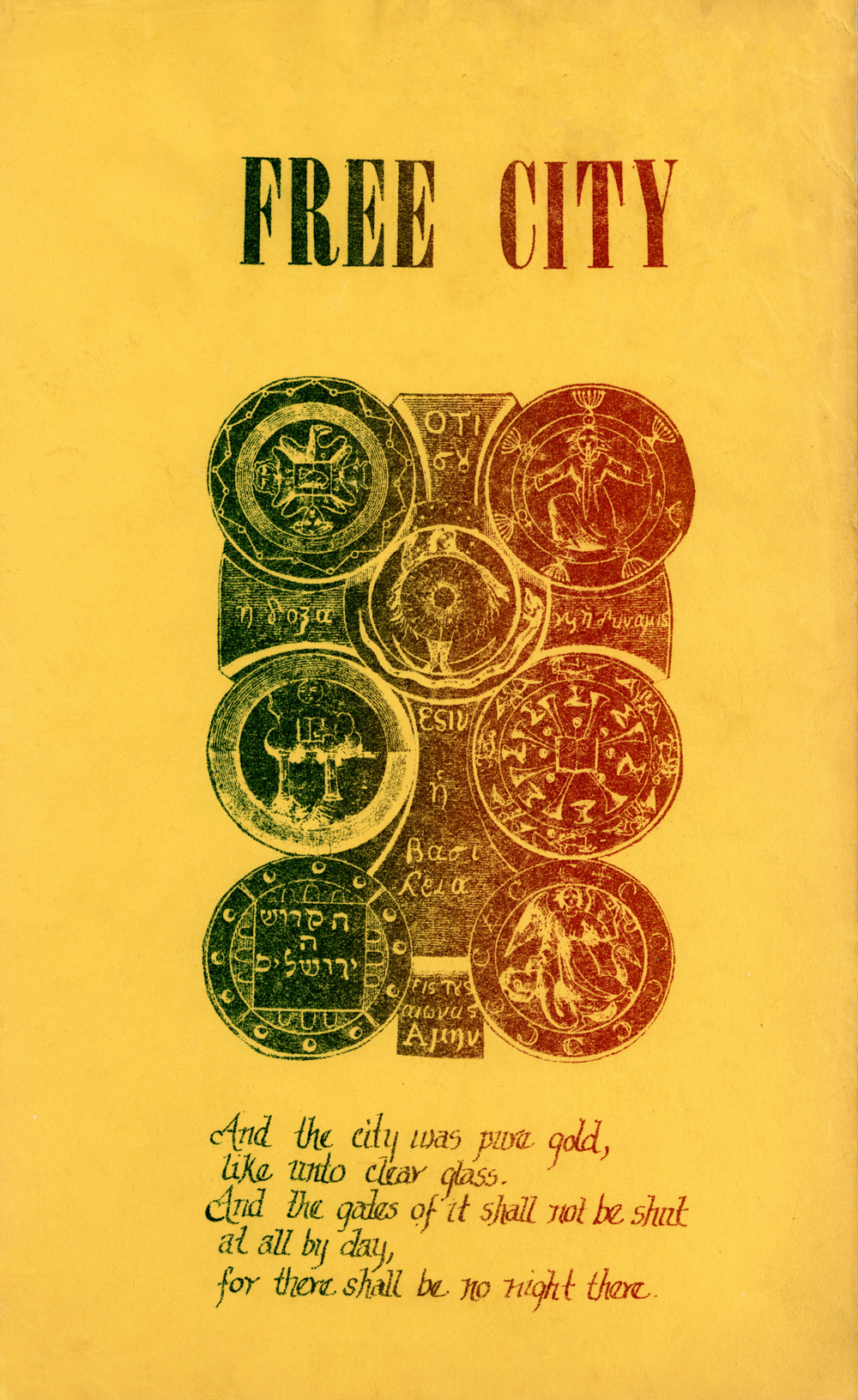 Cat. No.: FC-2-001 Full record BibCit: n.d., ca. 11/1/1967. Broadside. San Francisco: Free City Collective. Collection: SOLA-o; SS-o (MH). Abstract: This opening sheet of the second Free City set marks both a conceptual and technical leap. The occult seals, the passage from Revelation, and the split-fountain mimeograph printing on the Gestetner inherited from the Communication Company cast the Free City as more than a social experiment: it appears here as a visionary commonwealth, at once mystical and communal. For David Simpson and Freeman House to pull off this effect on that machine must have been a first.