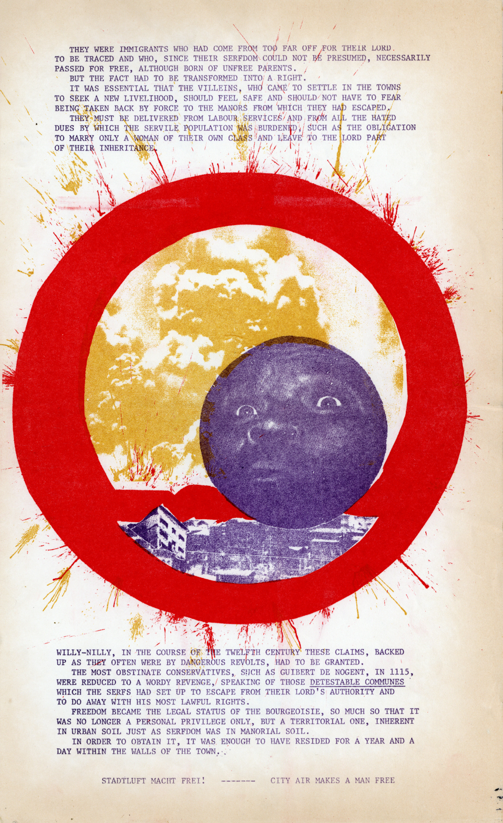 Cat. No.: FC-2-003 Full record BibCit: n.d., ca. 11/1/1967. Broadside. Legal size. San Francisco: Free City Collective. Collection: SOLA-o; SS-o (MH). Abstract: This sheet places the Free City in a much longer historical arc, linking the medieval town’s promise of refuge from feudal bondage to the countercultural hope of urban liberation in the present. The great red ring, the unsettling Black face, and the fragments of cityscape turn the page into an emblem of passage: a crossing into civic freedom that is at once communal and apocalyptic. “City air makes a man free” is invoked here not as quaint historical motto but as a charged proposition, suggesting that the city—if truly remade—might become a zone of release from inherited servitude.
