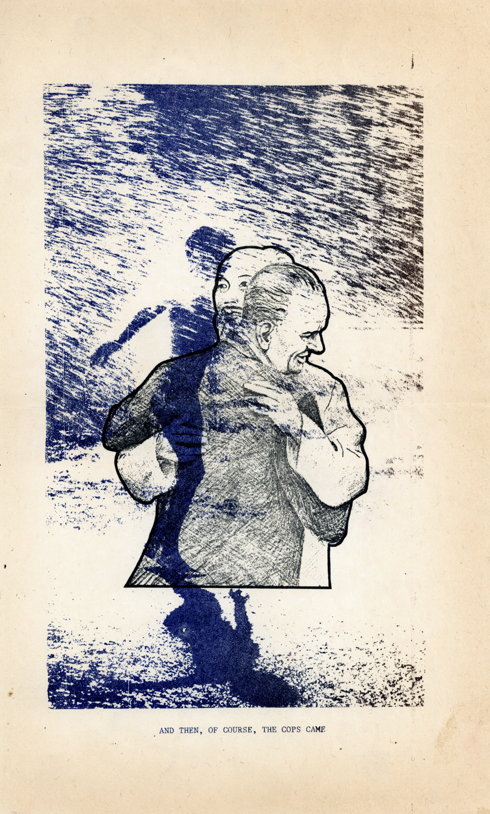 Cat. No.: FC-2-004 Full record BibCit: n.d., ca. 11/1/1967. Broadside. Legal size. San Francisco: Free City Collective. Collection: SOLA-o; SS-o (MH). Abstract: This sheet turns on the improbable image of Ho Chi Minh and Lyndon Johnson locked in an embrace, an image that works at once as political satire and as queer provocation. Read from a queer perspective, the piece becomes more than an absurd reconciliation of enemies: it stages forbidden male intimacy across one of the most militarized and hypermasculine divides of the era. The deadpan caption, “And then, of course, the cops came,” pulls that embrace back into the familiar machinery of repression, where geopolitics, sexual anxiety, and the policing of the body converge.