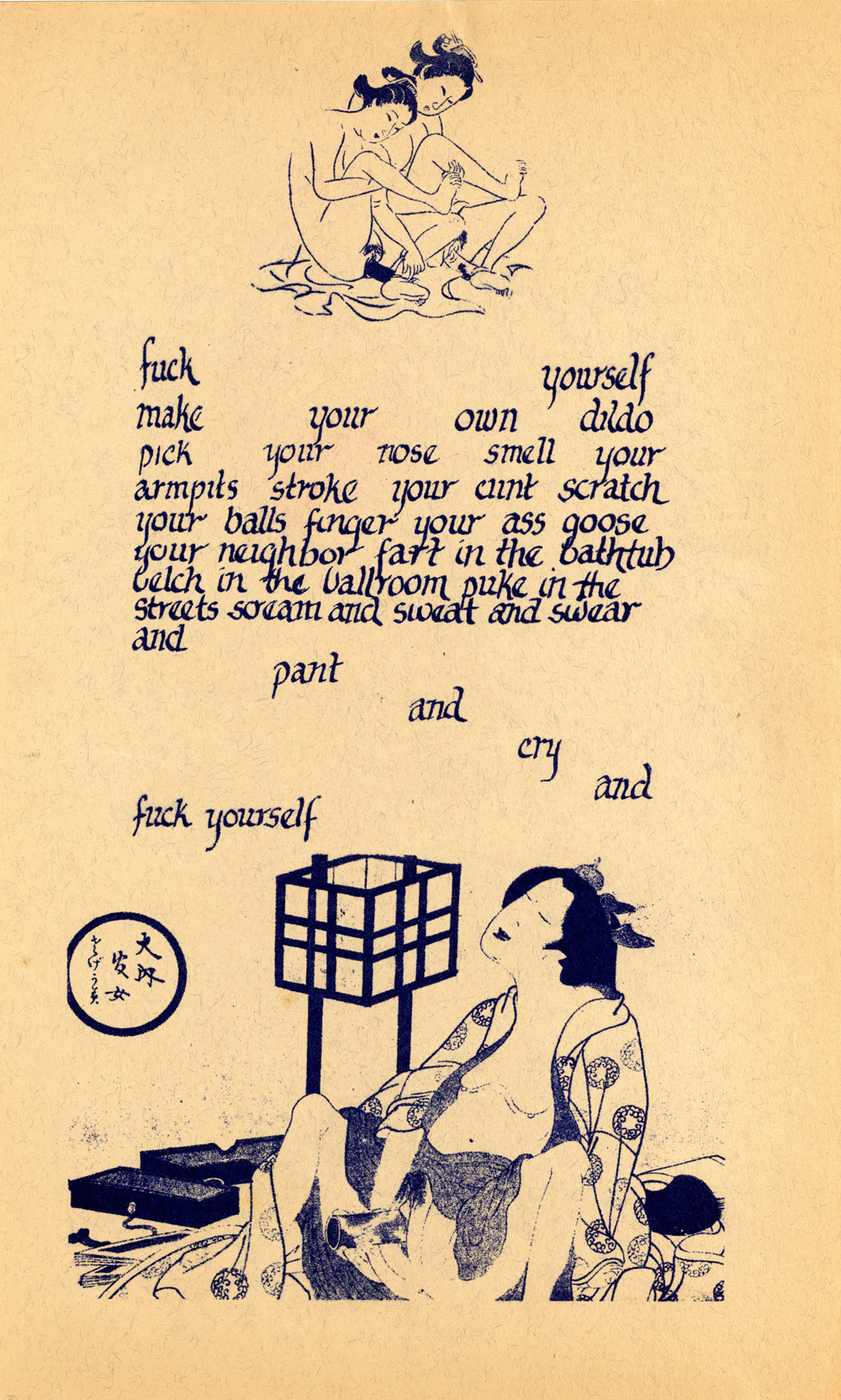 Cat. No.: FC-2-005 Full record BibCit: n.d., ca. 11/1/1967. Broadside. Legal size. San Francisco: Free City Collective. Collection: SOLA-o; SS-o (MH). Abstract: This sheet is a gleefully abrasive assault on decorum, self-importance, and the hypocrisies of polite society. Its litany of bodily acts and sensations, paired with appropriated Japanese erotic imagery, collapses the distance between obscenity, comedy, and liberation, insisting that the body in all its appetites and indignities must be brought back into view. In the context of Free City, it reads as a deliberately offensive manifesto of anti-refinement, aimed at shattering the managed sensibility of both straight respectability and hip pretension.