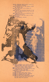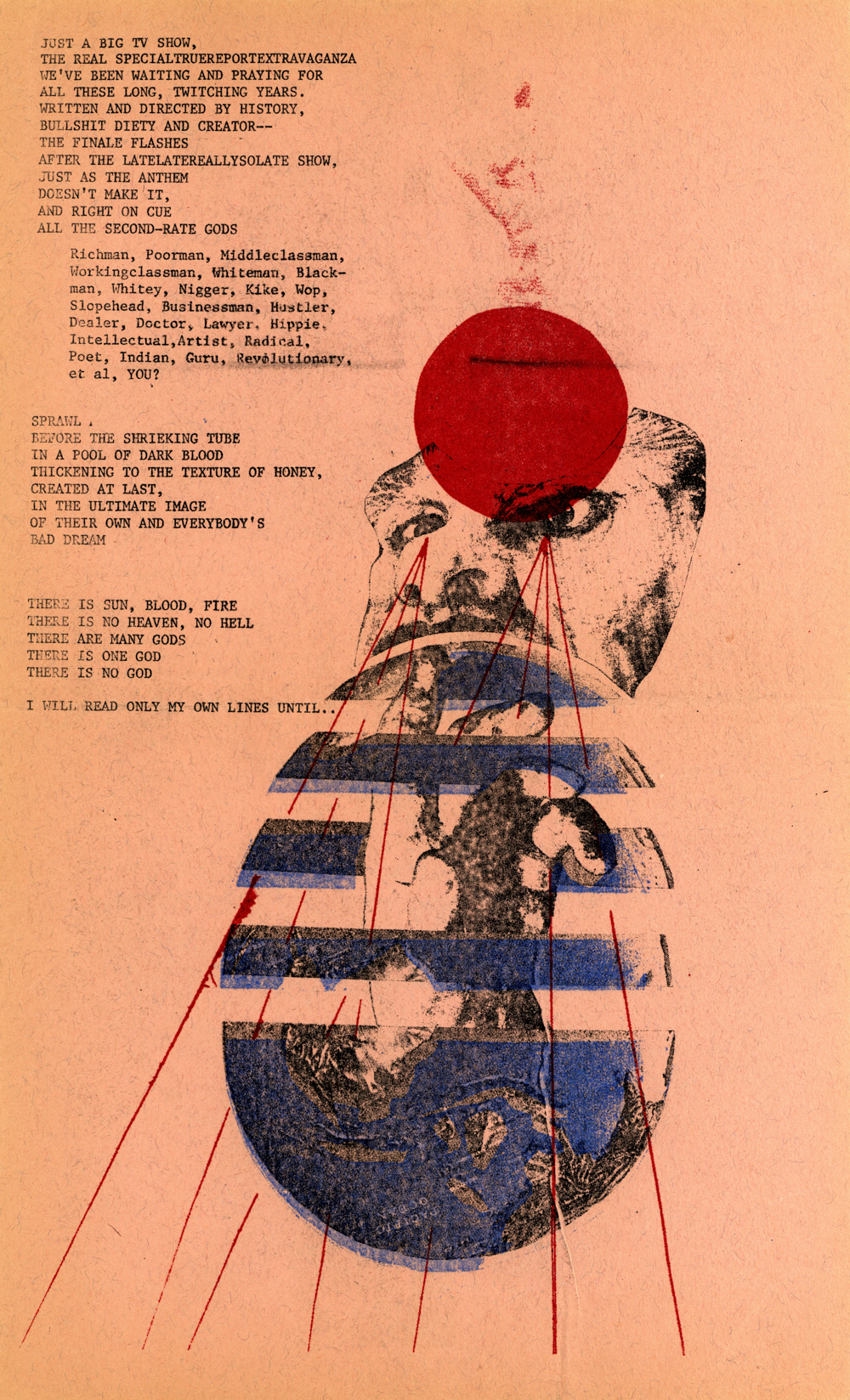 Cat. No.: FC-2-006b Full record BibCit: n.d., ca. 11/1/1967. Broadsheet. Legal size. San Francisco: Free City Collective. Collection: SOLA-o; SS-o (MH). Abstract: This companion piece to the reverse side pushes the critique of modern civilization into the register of nightmare spectacle. History appears here as a grotesque media event—part blood ritual, part collapsing theology, part televised hallucination—in which the categories by which people are sorted and managed and paraded only to be swallowed up in a bad dream of their own making. The closing line, “I will read only my own lines until…,” suggests a refusal of the prefabricated script, as though the only possible answer to this shrieking pageant were to step out of the roles history has assigned.