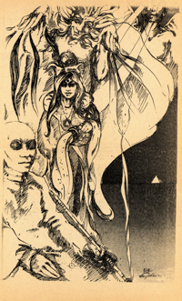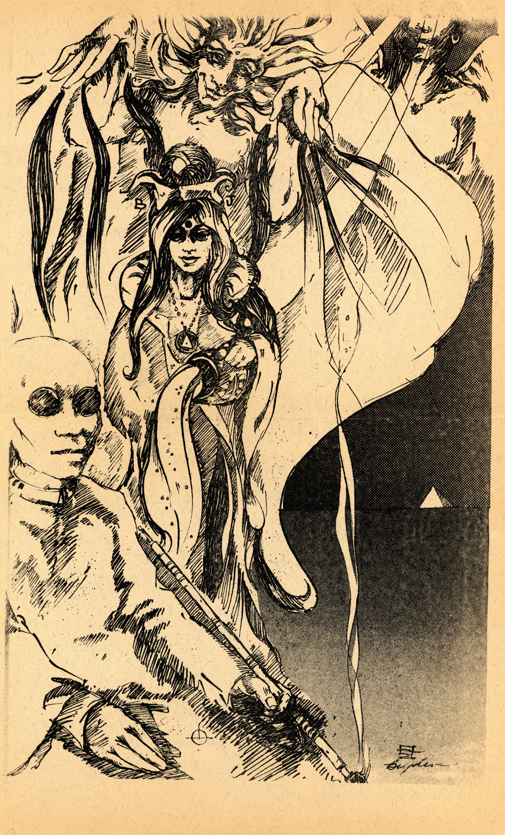 Cat. No.: FC-2-007 Full record BibCit: n.d., ca. 11/1/1967. Broadside. Legal size. San Francisco: Free City Collective. Collection: SOLA-o; SS-o (MH). Abstract: This image introduces a fantastical, almost tarot-like register into the Free City sequence. The horned woman, the bearded sorcerer figure, and the blank-eyed attendant suggest a procession of archetypes drawn from the occult revival, underground comics, and psychedelic poster art, where erotic power, ritual knowledge, and theatrical menace are all held in suspension. In the context of Free City, the piece reads as an emblem of the visionary imagination itself: seductive, ceremonial, and slightly dangerous, as though the new city required not only politics and prophecy but its own mythology.