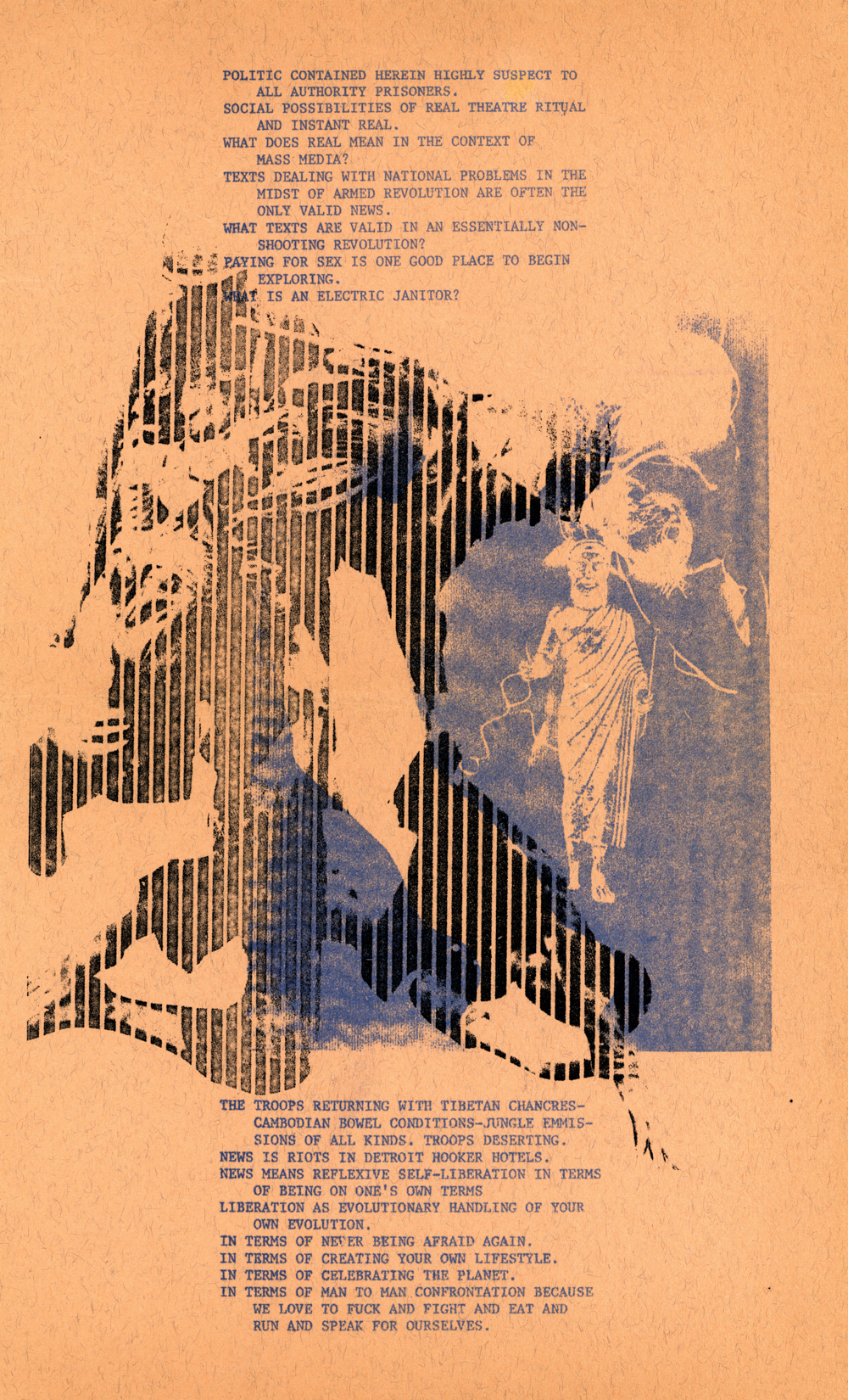 Cat. No.: FC-2-008 Full record BibCit: n.d., ca. 11/1/1967. Broadside. Legal size. San Francisco: Free City Collective. Collection: SOLA-o; SS-o (MH). Abstract: This sheet is one of Free City’s more explicit meditations on the problem of “news” in a revolutionary culture that is not, at least yet, founded on armed struggle. The text rejects the authority of mass media and official politics in favor of “instant real,” social theater, sexual candor, self-liberation, and the making of one’s own life as the valid ground of revolutionary speech. The layered imagery—part prison bars, part planetary or ritual apparition—suggests both confinement and breakthrough, as though the task were to invent forms of consciousness and communication adequate to liberation on one’s own terms.