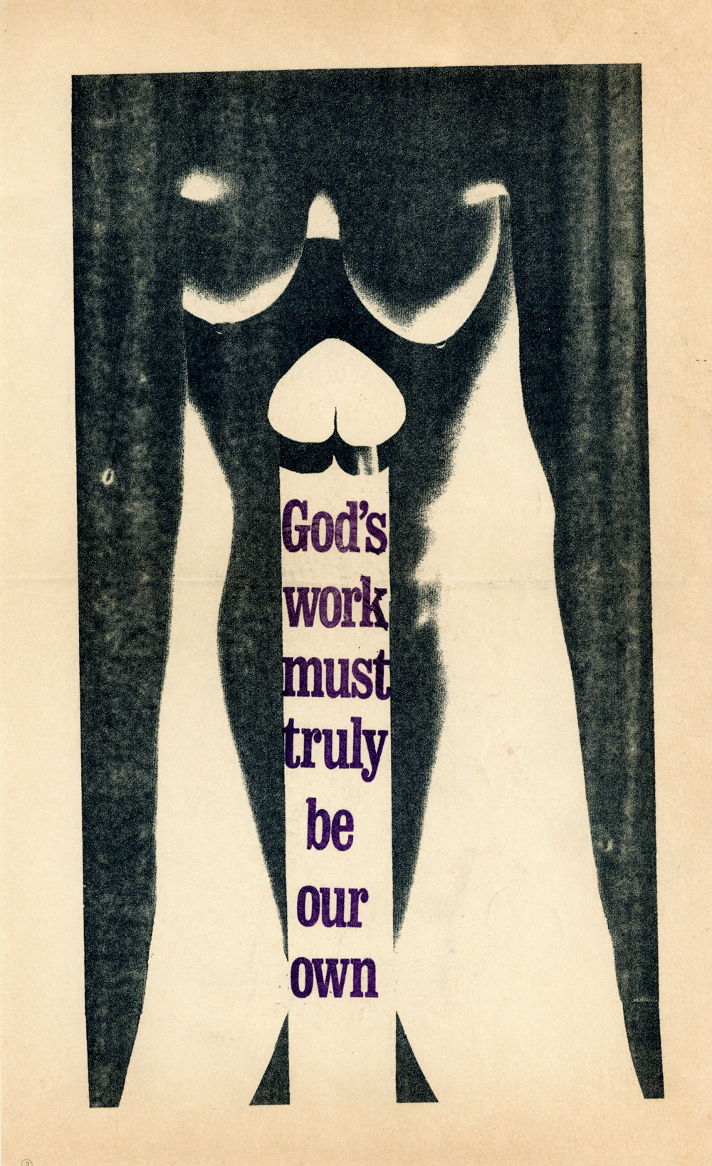 Cat. No.: FC-2-009 Full record BibCit: n.d., ca. 11/1/1967. Legal size. San Francisco: Free City Collective. Collection: SOLA-o; SS-o (MH). Abstract: This sheet reduces its message to a stark sexual icon: a frontal body in which female and male forms are fused, the erect phallus set within an otherwise female torso to create an androgynous or hieratic emblem of generative power. The slogan, “God’s work must truly be our own,” is thus made literal through the body itself, suggesting that creation, liberation, and sacred authority are not to be delegated upward but reclaimed in human form. Spare, confrontational, and deliberately unsettling, the design turns sexual wholeness into manifesto.