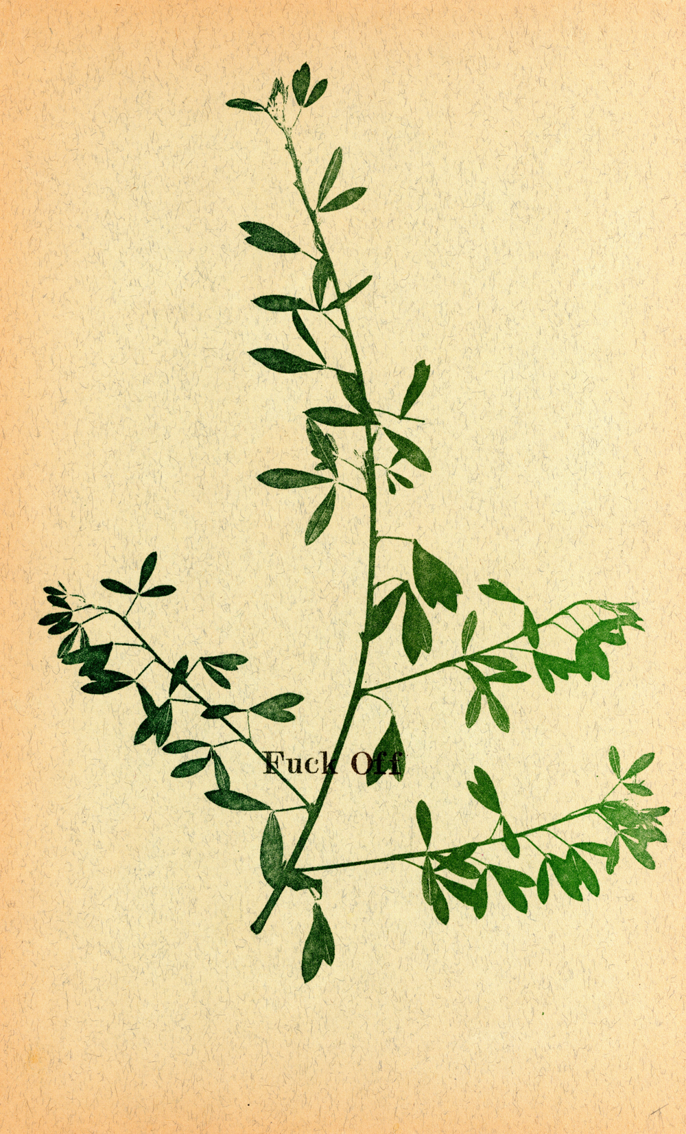 Cat. No.: FC-2-010 Full record BibCit: n.d., ca. 11/1/1967. Broadside. Legal size. San Francisco: Free City Collective. Collection: SOLA-o; SS-o (MH). Abstract: As the final sheet in the second Free City set, with only this image on the back of the sheet, the piece reads like a parting shot. A delicate botanical specimen is overprinted with the blunt imperative “Fuck Off,” the joke residing in the contrast between courtesy of form and discourtesy of message. In that final position, the sheet becomes an elegant rebuff to intrusion, authority, or unwanted claim on the self: a deadpan farewell and a last irreverent flourish at the end of the sequence.