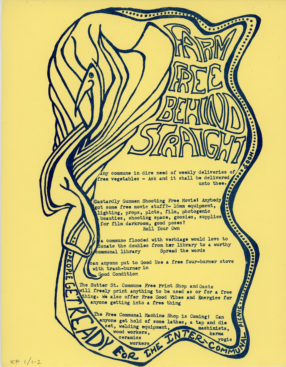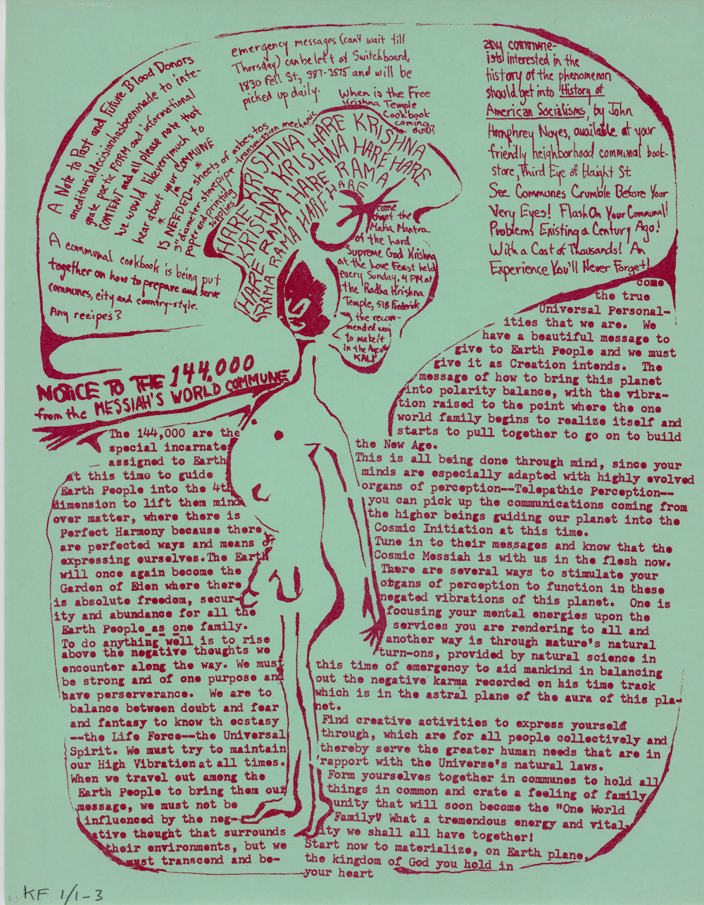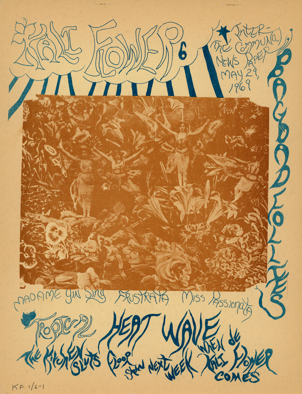 « First ‹ Prev Page 30 of 40 Next › Last » Kali Flower. Cat. No.: FPS-288 Full record BibCit: N.d., ca.. Broadside. San Francisco: Free Print Shop. Collection: o-DIA. Note: Wall poster on card stock for posting the location where Kaliflowers were kept in communes. Comets You Are. Cat. No.: FPS-289 Full record BibCit: Lookup date. Folder. San Francisco: Free Print Shop. Collection: o-DIA. Note: Program for an Angels of Light show Sci-Clones. Cat. No.: FPS-290 Full record BibCit: Lookup date 3/19/1978. Broadside. San Francisco: Free Print Shop. Collection: o-DIA. Note: Poster for an Angels of Light show Once Upon A Time. Cat. No.: FPS-291 Full record BibCit: Lookup date. Folder. San Francisco: Free Print Shop. Collection: o-DIA. Note: Program for an Angels of Light show Angels In Morning. Cat. No.: FPS-292 Full record BibCit: Lookup date. Folder. San Francisco: Free Print Shop. Collection: o-DIA. Note: Program for an Angels of Light show Out Of The Pantry. Cat. No.: FPS-293 Full record BibCit: Lookup date. Folder. San Francisco: Free Print Shop. Collection: o-DIA. Note: Critique of food conspiracy movement. The Angels of Light in Inferno Reason. Cat. No.: FPS-294 Full record BibCit: Lookup date. Broadside. San Francisco: Free Print Shop. Collection: o-DIA. Note: Announcement for an Angels of Light show. The Angels of Light in Allah Mode. Cat. No.: FPS-295 Full record BibCit: Lookup date. Broadside. San Francisco: Free Print Shop. Collection: o-DIA. Note: Announcement for an Angels of Light show. Kaliflower, vol. 1, no. 1, p. 1. Cat. No.: KF-v01-n01-p001 Full record BibCit: 4/24/1969. Kaliflower, vol. 01, no. 01, p. 001. Newspaper. Letter . Collection: SOLA-o. Kaliflower, vol. 1, no. 1, p. 2. Cat. No.: KF-v01-n01-p002 Full record BibCit: 4/24/1969. Kaliflower, vol. 01, no. 01, p. 002. Newspaper. Letter size. Collection: SOLA-o. Kaliflower, vol. 1, no. 1, p. 3. Cat. No.: KF-v01-n01-p003 Full record BibCit: 4/24/1969. Kaliflower, vol. 01, no. 01, p. 003. Newspaper. Letter . Collection: SOLA-o. Kaliflower, vol. 1, no. 1, p. 4. Cat. No.: KF-v01-n01-p004 Full record BibCit: 4/24/1969. Kaliflower, vol. 01, no. 01, p. 004. Newspaper. Letter . Collection: SOLA-o. Kaliflower, vol. 1, no. 2, p. 1. Cat. No.: KF-v01-n02-p001 Full record BibCit: 5/1/1969. Kaliflower, vol. 01, no. 02, p. 001. Newspaper. Letter . Collection: SOLA-o. Kaliflower, vol. 1, no. 2, p. 2. Cat. No.: KF-v01-n02-p002 Full record BibCit: 5/1/1969. Kaliflower, vol. 01, no. 02, p. 002. Newspaper. Letter . Collection: SOLA-o. Kaliflower, vol. 1, no. 2, p. 3. Cat. No.: KF-v01-n02-p003 Full record BibCit: 5/1/1969. Kaliflower, vol. 01, no. 02, p. 003. Newspaper. Letter . Collection: SOLA-o. Kaliflower, vol. 1, no. 3, p. 1. Cat. No.: KF-v01-n03-p001 Full record BibCit: 5/8/1969. Kaliflower, vol. 01, no. 03, p. 001. Newspaper. Letter . Collection: SOLA-o. Kaliflower, vol. 1, no. 4, p. 1. Cat. No.: KF-v01-n04-p001 Full record BibCit: 5/15/1969. Kaliflower, vol. 01, no. 04, p. 001. Newspaper. Letter . Collection: SOLA-o. Kaliflower, vol. 1, no. 4, p. 2. Cat. No.: KF-v01-n04-p002 Full record BibCit: 5/15/1969. Kaliflower, vol. 01, no. 04, p. 002. Newspaper. Letter . Collection: SOLA-o. Kaliflower, vol. 1, no. 4, p. 3. Cat. No.: KF-v01-n04-p003 Full record BibCit: 5/15/1969. Kaliflower, vol. 01, no. 04, p. 003. Newspaper. Letter . Collection: SOLA-o. Kaliflower, vol. 1, no. 4, p. 4. Cat. No.: KF-v01-n04-p004 Full record BibCit: 5/15/1969. Kaliflower, vol. 01, no. 04, p. 004. Newspaper. Letter . Collection: SOLA-o. Kaliflower, vol. 1, no. 5, p. 1. Cat. No.: KF-v01-n05-p001 Full record BibCit: 5/22/1969. Kaliflower, vol. 01, no. 05, p. 001. Newspaper. Letter . Collection: SOLA-o. Kaliflower, vol. 1, no. 5, p. 2. Cat. No.: KF-v01-n05-p002 Full record BibCit: 5/22/1969. Kaliflower, vol. 01, no. 05, p. 002. Newspaper. Letter . Collection: SOLA-o. Kaliflower, vol. 1, no. 6, p. 1. Cat. No.: KF-v01-n06-p001 Full record BibCit: 5/29/1969. Kaliflower, vol. 01, no. 06, p. 001. Newspaper. Letter . Collection: SOLA-o. Kaliflower, vol. 1, no. 6, p. 2. Cat. No.: KF-v01-n06-p002 Full record BibCit: 5/29/1969. Kaliflower, vol. 01, no. 06, p. 002. Newspaper. Letter . Collection: SOLA-o. Kaliflower, vol. 1, no. 6, p. 3. Cat. No.: KF-v01-n06-p003 Full record BibCit: 5/29/1969. Kaliflower, vol. 01, no. 06, p. 003. Newspaper. Letter . Collection: SOLA-o. « First ‹ Prev Page 30 of 40 Next › Last »