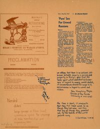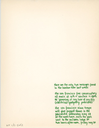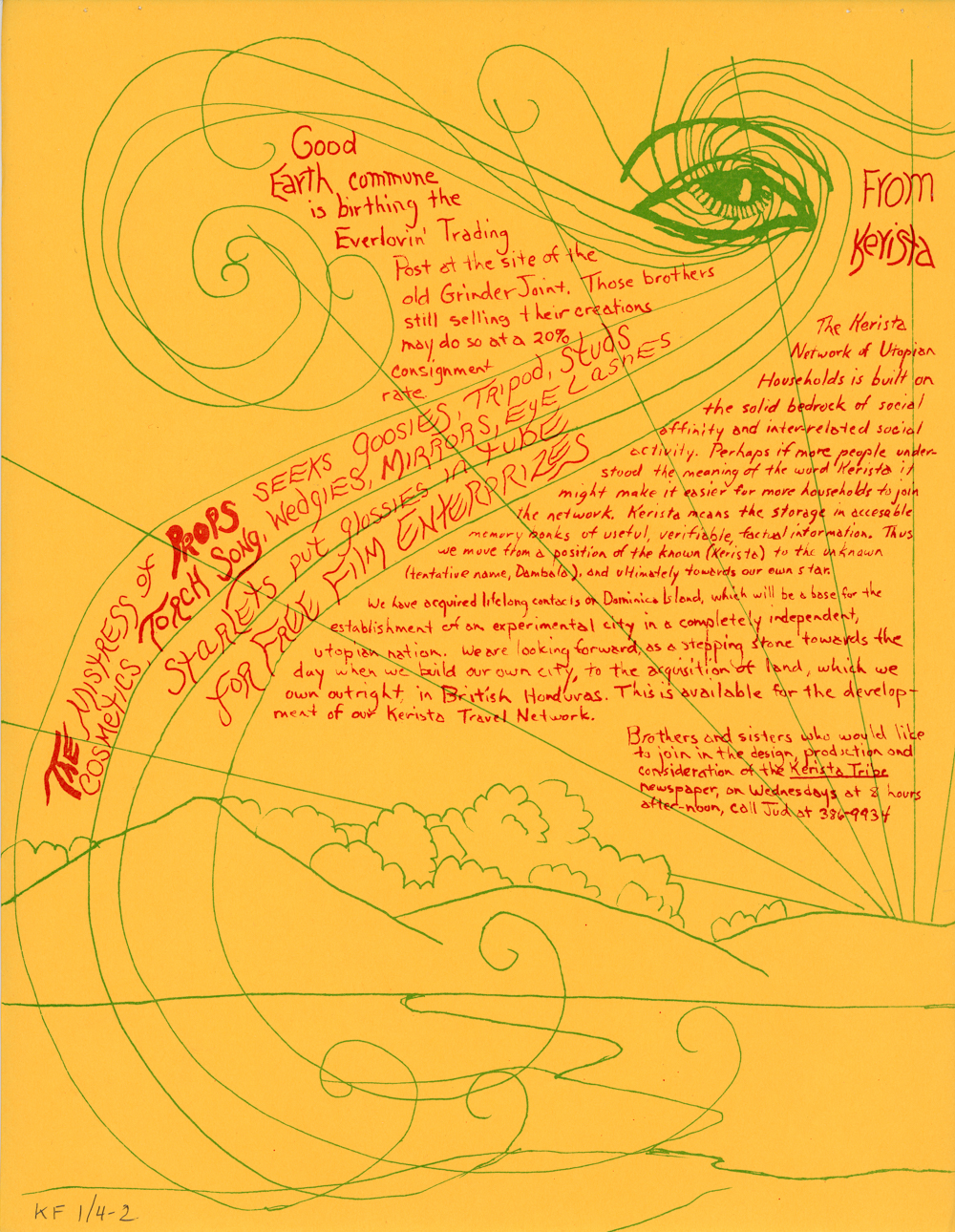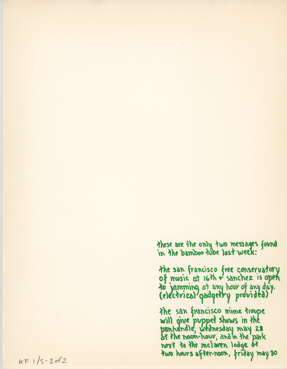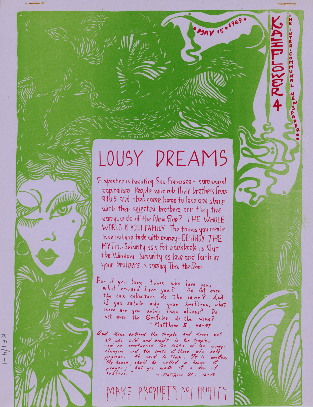 « First ‹ Prev Page 30 of 40 Next › Last » Kali Flower. Cat. No.: FPS-288 Full record BibCit: N.d., ca.. Broadside. San Francisco: Free Print Shop. Collection: o-DIA. Note: Wall poster on card stock for posting the location where Kaliflowers were kept in communes. Comets You Are. Cat. No.: FPS-289 Full record BibCit: Lookup date. Folder. San Francisco: Free Print Shop. Collection: o-DIA. Note: Program for an Angels of Light show Sci-Clones. Cat. No.: FPS-290 Full record BibCit: Lookup date 3/19/1978. Broadside. San Francisco: Free Print Shop. Collection: o-DIA. Note: Poster for an Angels of Light show Once Upon A Time. Cat. No.: FPS-291 Full record BibCit: Lookup date. Folder. San Francisco: Free Print Shop. Collection: o-DIA. Note: Program for an Angels of Light show Angels In Morning. Cat. No.: FPS-292 Full record BibCit: Lookup date. Folder. San Francisco: Free Print Shop. Collection: o-DIA. Note: Program for an Angels of Light show Out Of The Pantry. Cat. No.: FPS-293 Full record BibCit: Lookup date. Folder. San Francisco: Free Print Shop. Collection: o-DIA. Note: Critique of food conspiracy movement. The Angels of Light in Inferno Reason. Cat. No.: FPS-294 Full record BibCit: Lookup date. Broadside. San Francisco: Free Print Shop. Collection: o-DIA. Note: Announcement for an Angels of Light show. The Angels of Light in Allah Mode. Cat. No.: FPS-295 Full record BibCit: Lookup date. Broadside. San Francisco: Free Print Shop. Collection: o-DIA. Note: Announcement for an Angels of Light show. Kaliflower, vol. 1, no. 1, p. 1. Cat. No.: KF-v01-n01-p001 Full record BibCit: 4/24/1969. Kaliflower, vol. 01, no. 01, p. 001. Newspaper. Letter . Collection: SOLA-o. Kaliflower, vol. 1, no. 1, p. 2. Cat. No.: KF-v01-n01-p002 Full record BibCit: 4/24/1969. Kaliflower, vol. 01, no. 01, p. 002. Newspaper. Letter size. Collection: SOLA-o. Kaliflower, vol. 1, no. 1, p. 3. Cat. No.: KF-v01-n01-p003 Full record BibCit: 4/24/1969. Kaliflower, vol. 01, no. 01, p. 003. Newspaper. Letter . Collection: SOLA-o. Kaliflower, vol. 1, no. 1, p. 4. Cat. No.: KF-v01-n01-p004 Full record BibCit: 4/24/1969. Kaliflower, vol. 01, no. 01, p. 004. Newspaper. Letter . Collection: SOLA-o. Kaliflower, vol. 1, no. 2, p. 1. Cat. No.: KF-v01-n02-p001 Full record BibCit: 5/1/1969. Kaliflower, vol. 01, no. 02, p. 001. Newspaper. Letter . Collection: SOLA-o. Kaliflower, vol. 1, no. 2, p. 2. Cat. No.: KF-v01-n02-p002 Full record BibCit: 5/1/1969. Kaliflower, vol. 01, no. 02, p. 002. Newspaper. Letter . Collection: SOLA-o. Kaliflower, vol. 1, no. 2, p. 3. Cat. No.: KF-v01-n02-p003 Full record BibCit: 5/1/1969. Kaliflower, vol. 01, no. 02, p. 003. Newspaper. Letter . Collection: SOLA-o. Kaliflower, vol. 1, no. 3, p. 1. Cat. No.: KF-v01-n03-p001 Full record BibCit: 5/8/1969. Kaliflower, vol. 01, no. 03, p. 001. Newspaper. Letter . Collection: SOLA-o. Kaliflower, vol. 1, no. 4, p. 1. Cat. No.: KF-v01-n04-p001 Full record BibCit: 5/15/1969. Kaliflower, vol. 01, no. 04, p. 001. Newspaper. Letter . Collection: SOLA-o. Kaliflower, vol. 1, no. 4, p. 2. Cat. No.: KF-v01-n04-p002 Full record BibCit: 5/15/1969. Kaliflower, vol. 01, no. 04, p. 002. Newspaper. Letter . Collection: SOLA-o. Kaliflower, vol. 1, no. 4, p. 3. Cat. No.: KF-v01-n04-p003 Full record BibCit: 5/15/1969. Kaliflower, vol. 01, no. 04, p. 003. Newspaper. Letter . Collection: SOLA-o. Kaliflower, vol. 1, no. 4, p. 4. Cat. No.: KF-v01-n04-p004 Full record BibCit: 5/15/1969. Kaliflower, vol. 01, no. 04, p. 004. Newspaper. Letter . Collection: SOLA-o. Kaliflower, vol. 1, no. 5, p. 1. Cat. No.: KF-v01-n05-p001 Full record BibCit: 5/22/1969. Kaliflower, vol. 01, no. 05, p. 001. Newspaper. Letter . Collection: SOLA-o. Kaliflower, vol. 1, no. 5, p. 2. Cat. No.: KF-v01-n05-p002 Full record BibCit: 5/22/1969. Kaliflower, vol. 01, no. 05, p. 002. Newspaper. Letter . Collection: SOLA-o. Kaliflower, vol. 1, no. 6, p. 1. Cat. No.: KF-v01-n06-p001 Full record BibCit: 5/29/1969. Kaliflower, vol. 01, no. 06, p. 001. Newspaper. Letter . Collection: SOLA-o. Kaliflower, vol. 1, no. 6, p. 2. Cat. No.: KF-v01-n06-p002 Full record BibCit: 5/29/1969. Kaliflower, vol. 01, no. 06, p. 002. Newspaper. Letter . Collection: SOLA-o. Kaliflower, vol. 1, no. 6, p. 3. Cat. No.: KF-v01-n06-p003 Full record BibCit: 5/29/1969. Kaliflower, vol. 01, no. 06, p. 003. Newspaper. Letter . Collection: SOLA-o. « First ‹ Prev Page 30 of 40 Next › Last »