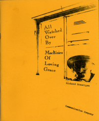 Cat. No.: CC-070 Full record BibCit: By Brautigan, Richard. Pamphlet. 7-1/8"x8-5/8". San Francisco: Communication Company. Collation: 10 sht., 18 pp., incl. cover. Stapled. Cover with illustration on yellow paper.. Collection: SS-o(?). Abstract: Book of poems.