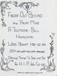 Cat. No.: CC-072 Full record BibCit: Broadside. Letter size. San Francisco: Communication Company. Collection: SS-x(M) | SOLA-x(SS). Abstract: Announces a benefit for the H.I.P. Job Co-op.
