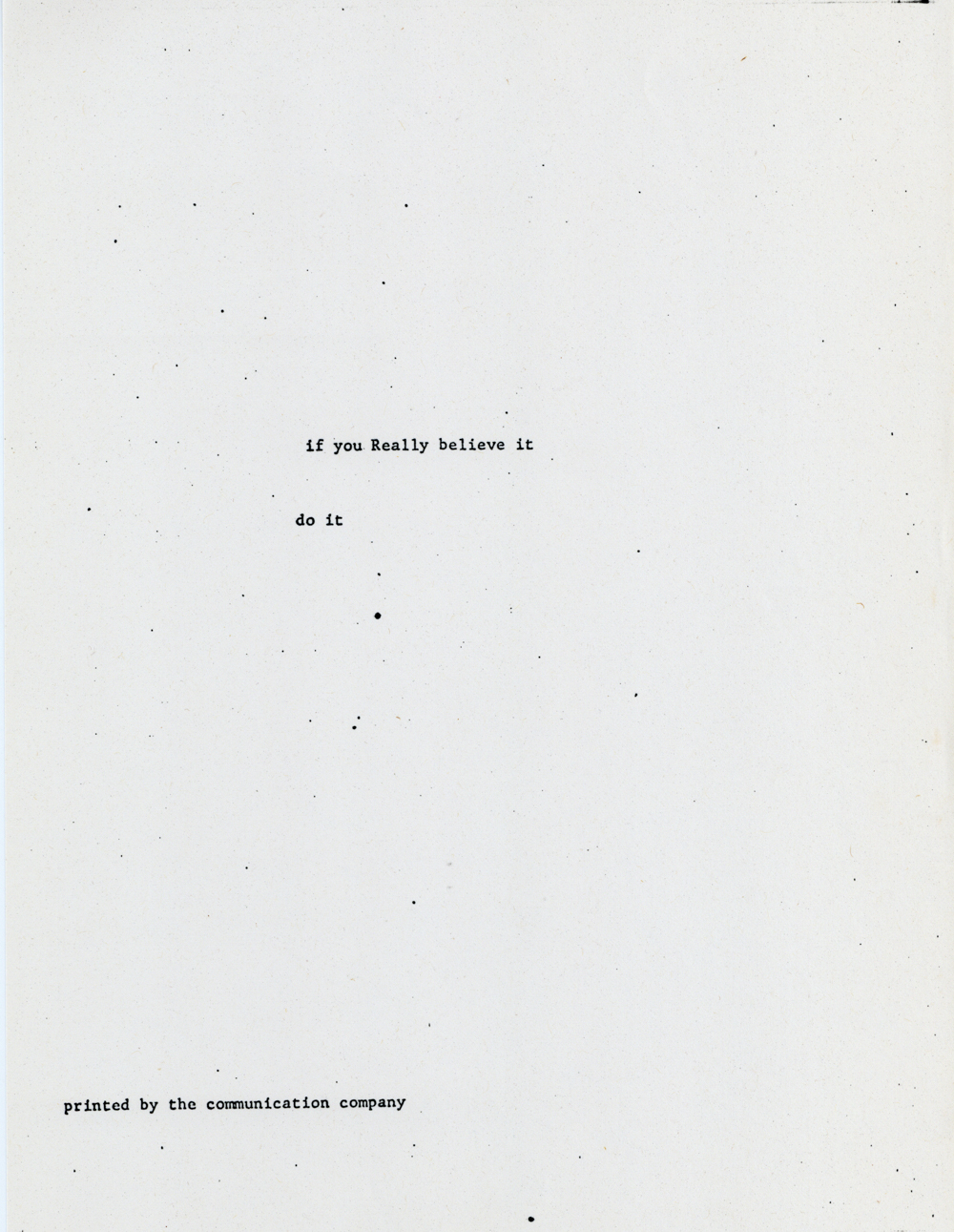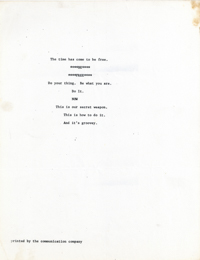 Cat. No.: CC-073 Full record BibCit: N.d., ca. 1/28/1967. Broadside. Letter size. San Francisco: Communication Company. Imprint: the communication company. Collation: Text is centered, vertically and horizontally (roughly.). Collection: SS-x(M) | SOLA-x(SS);o-BL/CA. Abstract: Poem, nine lines. Earliest publication of phrase "Do your thing."