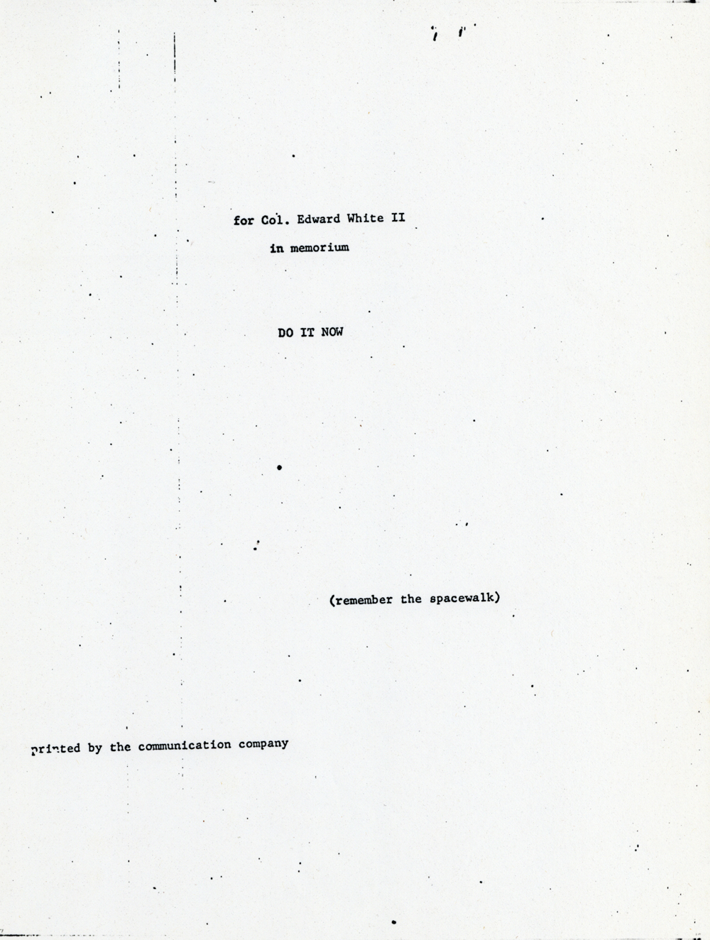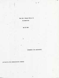 Cat. No.: CC-074 Full record BibCit: By [Anderson, Chester]. N.d., ca. 1/28/1967. Broadside. Letter size. San Francisco: Communication Company. Imprint: communication company. Collation: Typewriter text; BlTy/WhPa.. Collection: SS-x(M) | SOLA-x(SS);o-BL/CA. Abstract: A poem in memory of Col. Edward White II, one of Chester Anderson's "very few personal heroes."