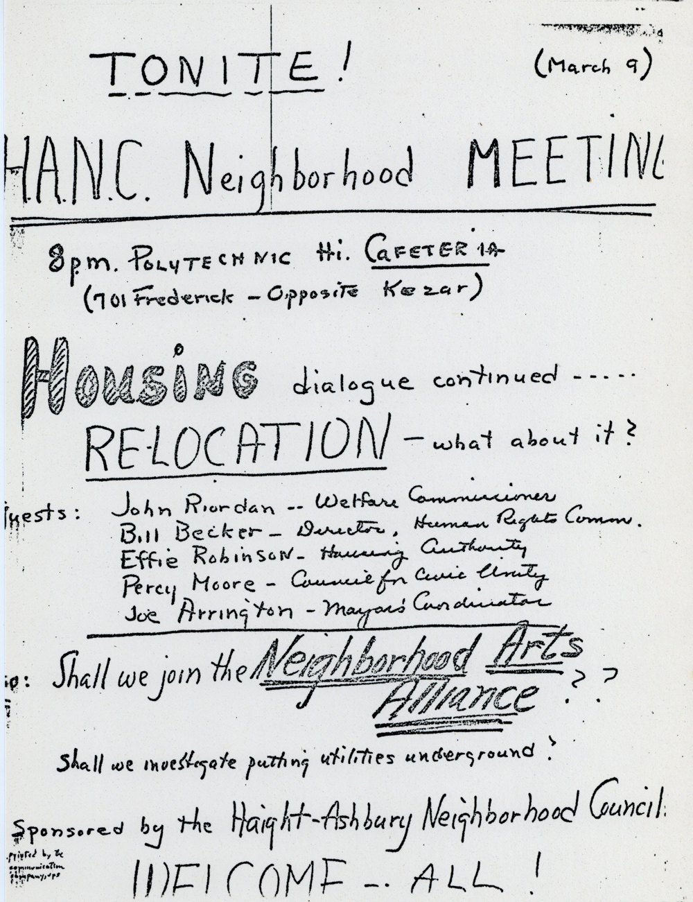 Cat. No.: CC-075 Full record BibCit: 3/9/1967. Broadside. Letter size. San Francisco: Communication Company. Imprint: communication company, ups. Collection: SS-x(m) | SOLA-x(ss). Abstract: Announcement of community meeting.