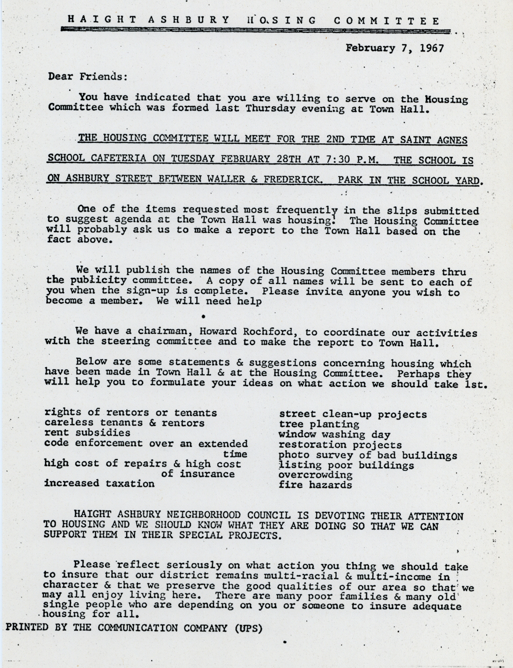 | Haight Ashbury Hosing [sic] Committee/February 7, 1967/Dear Friends:....