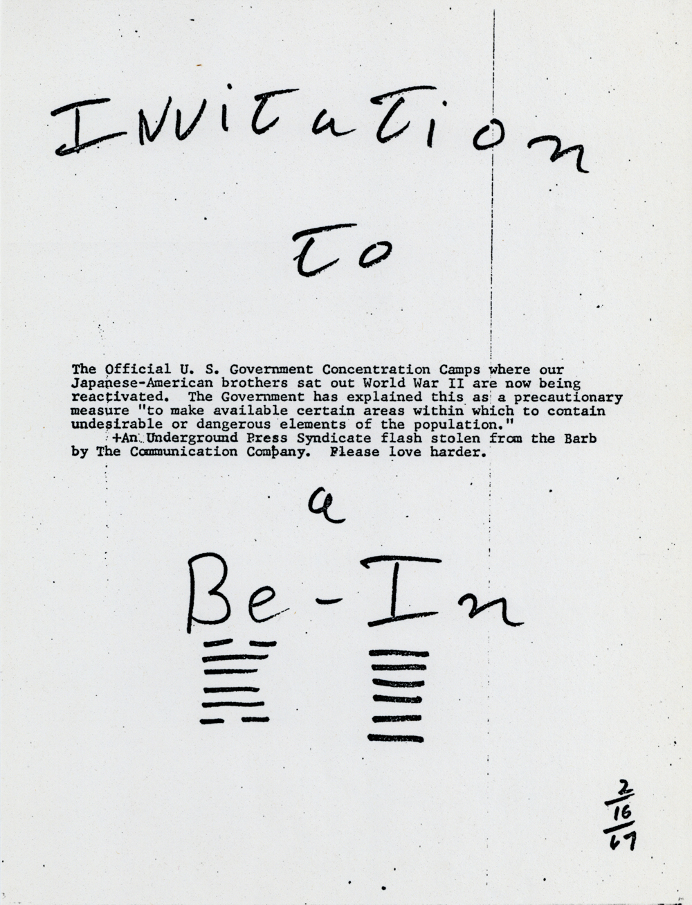 Cat. No.: CC-078 Full record BibCit: 2/16/1967. Broadside. Letter size. San Francisco: Communication Company. Imprint: Communication Company. Collation: Title is hand-lettered. Two I Ching hexagrams at bottom of page.. Collection: SS-x(M) | SOLA-x(SS). Abstract: A news "flash" about the U.S. preparing concentration camps for "dangerous elements of the population."