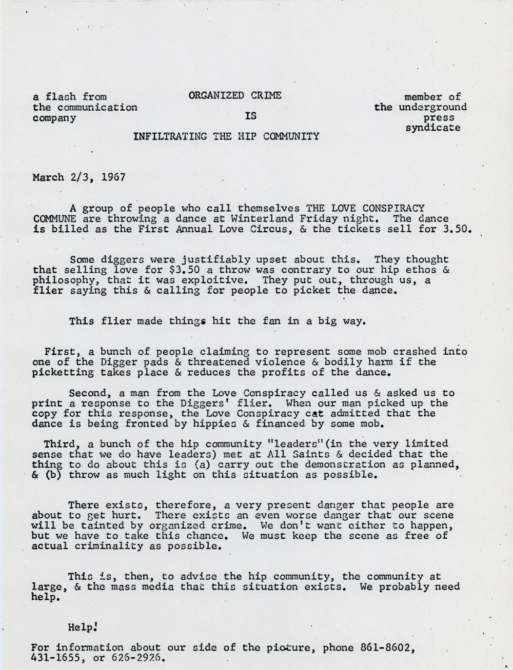 Cat. No.: CC-079 Full record BibCit: 3/2-3/67 3/2/1967. Broadside. Letter size. San Francisco: Communication Company. Imprint: communication company member of the .... Collection: SS-x(M) | SOLA-x(SS). Abstract: A "flash" about the upcoming First Annual Love Circus which the diggers are threatening to picket.