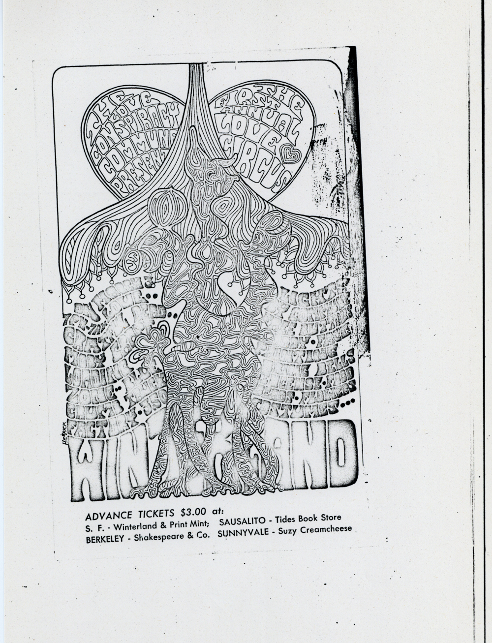 Cat. No.: CC-080 Full record BibCit: Broadside. 5-1/2"x8-5/8". ??. Collation: 2/c:Re,Bl. Collection: SS-o(AB) | SOLA-x(SS). Abstract: Handbill announcing The First Annual Love Circus on March 3 at Winterland ($3.50) presented by the Love Conspiracy Commune.