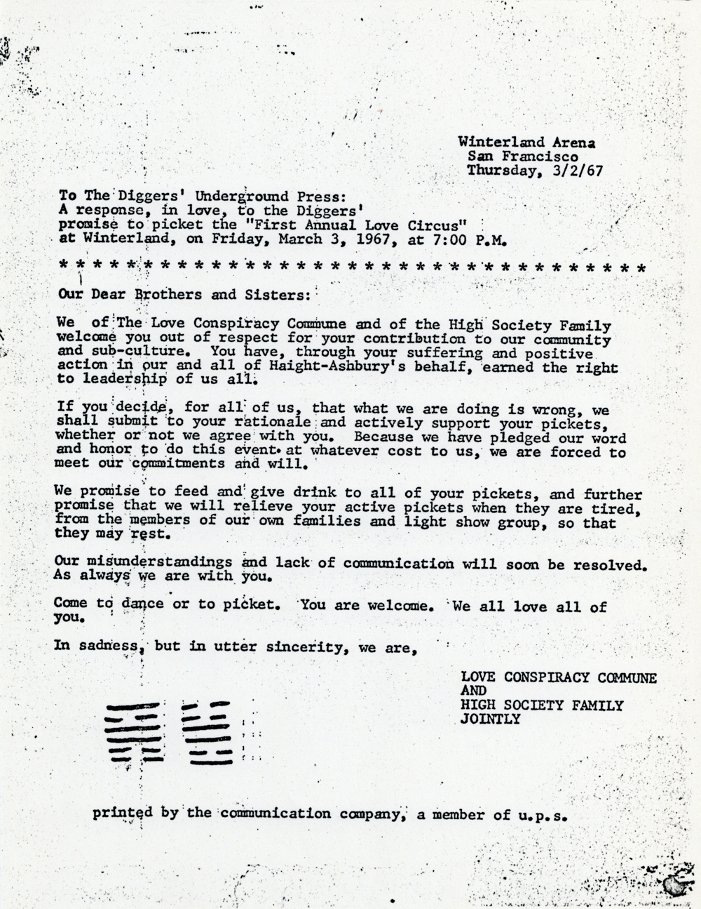 Cat. No.: CC-081 Full record BibCit: ca. 3.2.67. Broadside. Letter size. San Francisco: Communication Company. Collection: SS-x(m) | SOLA-x(ss). Abstract: A reply from Love Conspiracy Commune, with two appended hexgrams.