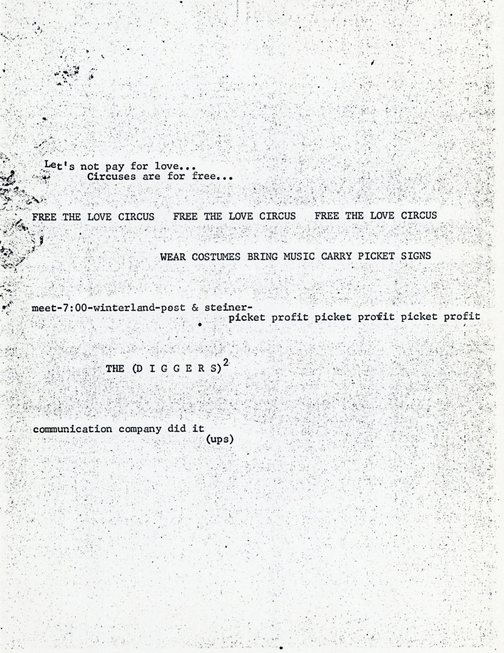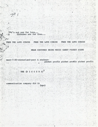 Cat. No.: CC-082 Full record BibCit: By The (Diggers)². nd. Broadside. Letter size. San Francisco: Communication Company. Collection: SS-x(m) | SOLA-x(ss). Abstract: Announces a picket of Love Circus.