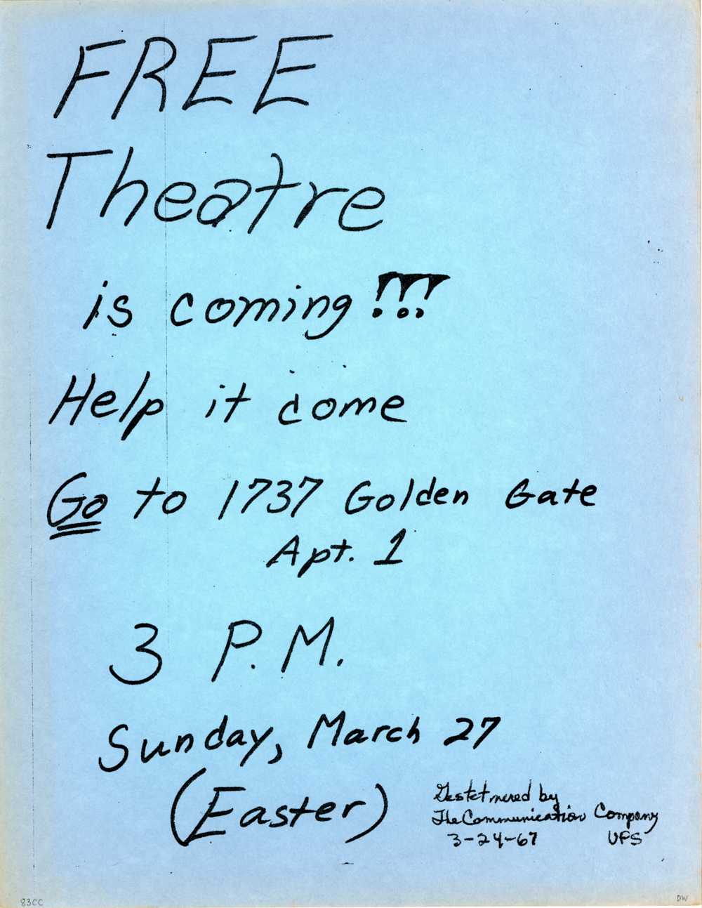 Cat. No.: CC-083 Full record BibCit: 3/24/1967. Broadside. Letter size. San Francisco: Communication Company. Collection: SS-x(m) | SOLA-x(ss):SOLA-o(dw). Abstract: Announcing an event.