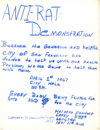 Cat. No.: CC-084 Full record BibCit: nd, ca 4/1/67. Broadside. Letter size. San Francisco: Communication Company. Imprint: ComCo (UPS). Collection: SS-x(m) | SOLA-x(ss):SOLA-o(dw). Abstract: To demonstrate against the city governement on April 1, 1967.